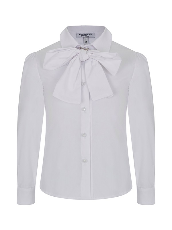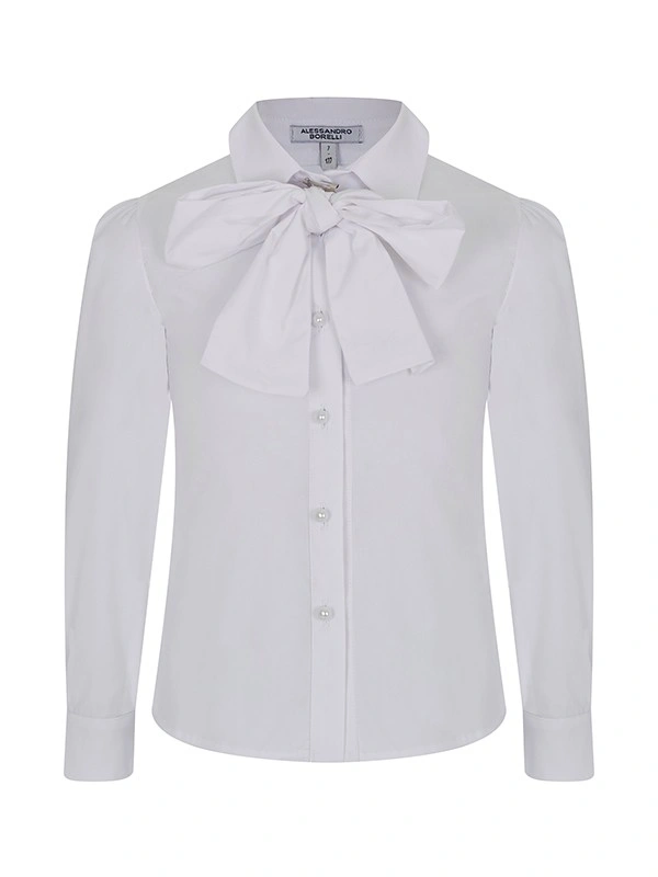 Блузка ALESSANDRO BORELLI для девочек – идеальное решение для школьных будней. Модель с длинным рукавом декорирована бантом, отложным воротником, манжетами и застежкой на пуговицы. Блузка будет идеально сочетаться как с брюками, так и с юбкой или сарафаном. Блуза выполнена из качественной ткани с большим добавлением хлопка, что позволяет с комфортом посещать занятия или торжественные мероприятия. За ней не нужно постоянно ухаживать, после стирки ткань не теряет форму и цвет. В нашем каталоге представлены модели для детей от 6 до 16 лет.