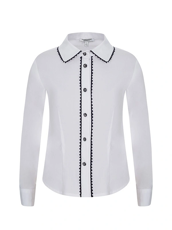 Блузка ALESSANDRO BORELLI для девочек – идеальное решение для школьных будней. Модель с длинным рукавом декорирована контрастным кружевом, отложным воротником, манжетами и застежкой на пуговицы. Блузка будет идеально сочетаться как с брюками, так и с юбкой или сарафаном. Блуза выполнена из качественной ткани с большим добавлением хлопка, что позволяет с комфортом посещать занятия или торжественные мероприятия. За ей не нужно постоянно ухаживать, после стирки ткань не теряет форму и цвет. В нашем каталоге представлены модели для детей от 6 до 16 лет.