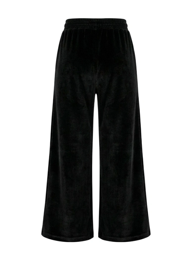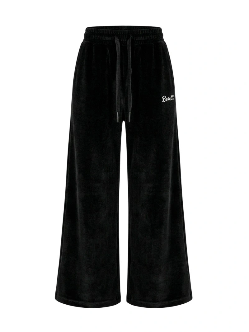 Черные вельветовые брюки палаццо для девочек. Элегантные широкие брюки черного цвета выполнены из мягкого велюра. Модель с эластичным поясом на резинке и черными шнурками для регулировки посадки. Свободный прямой крой создает комфортный современный силуэт. Бархатистый велюр добавляет благородство образу. На бедре справа — небольшая белая вышивка "Borelli" курсивом. Практичные боковые карманы. Универсальные брюки отлично сочетаются с футболками, свитшотами и толстовками.