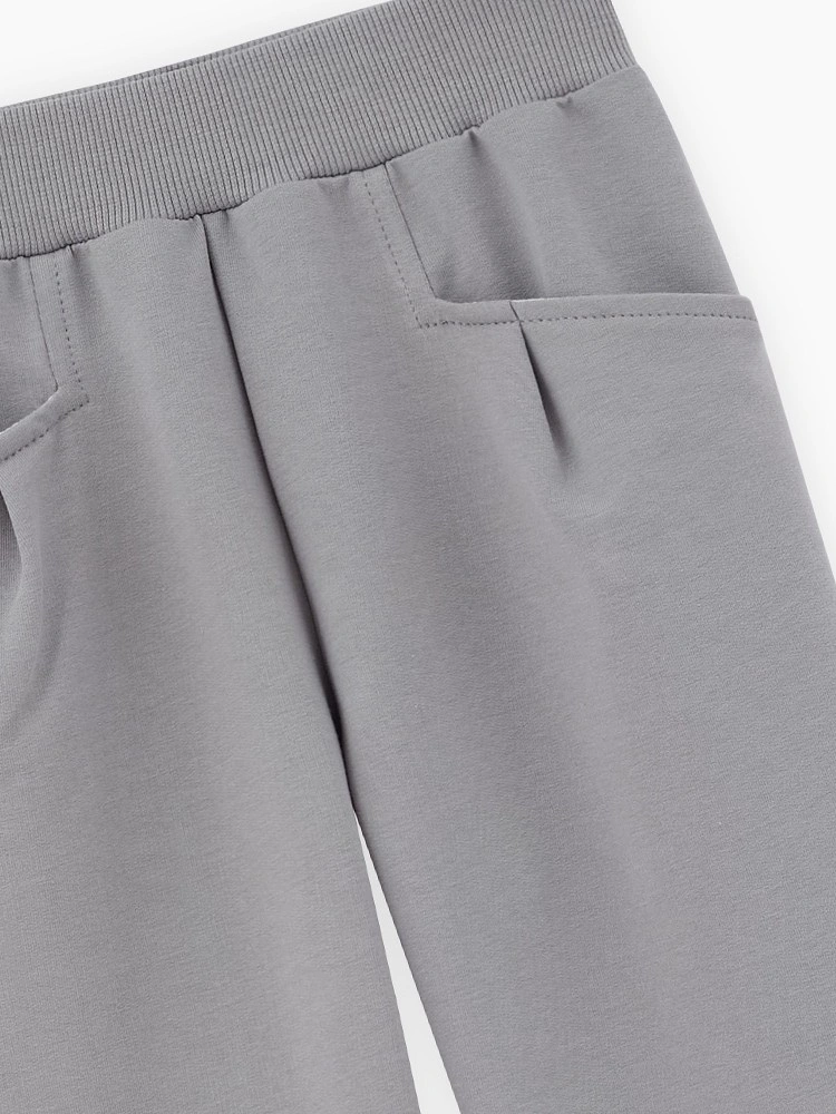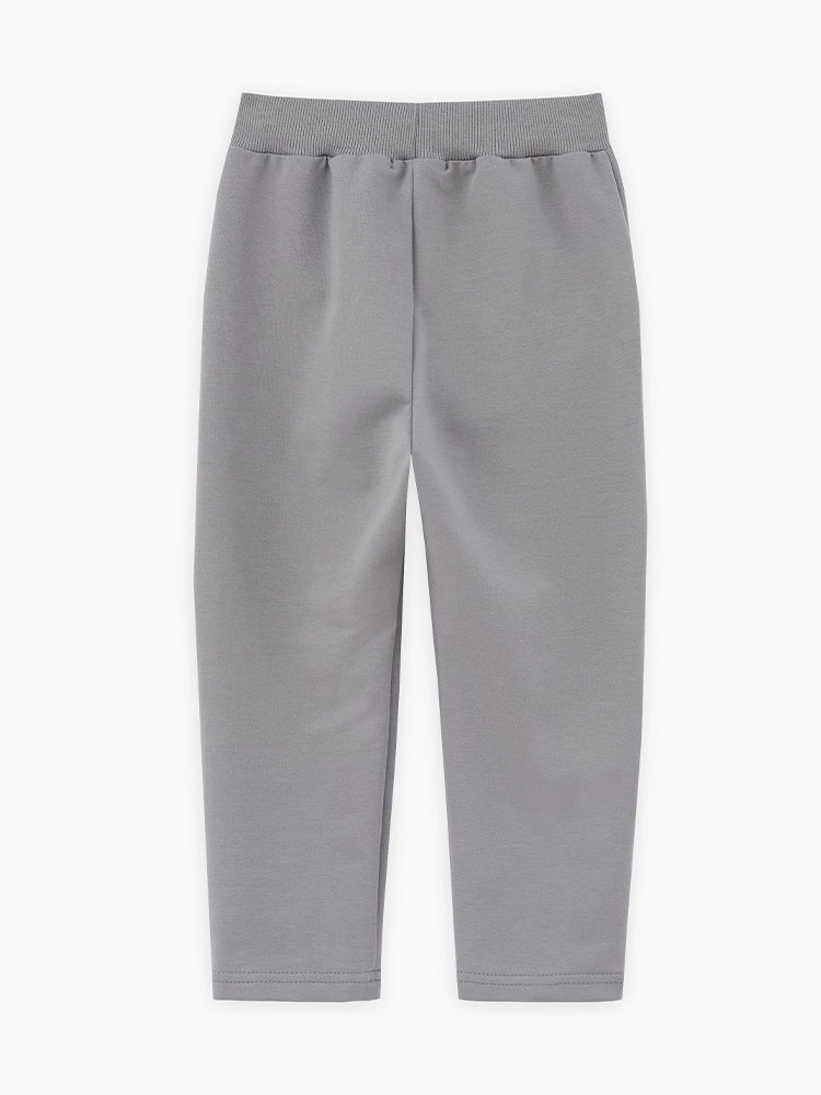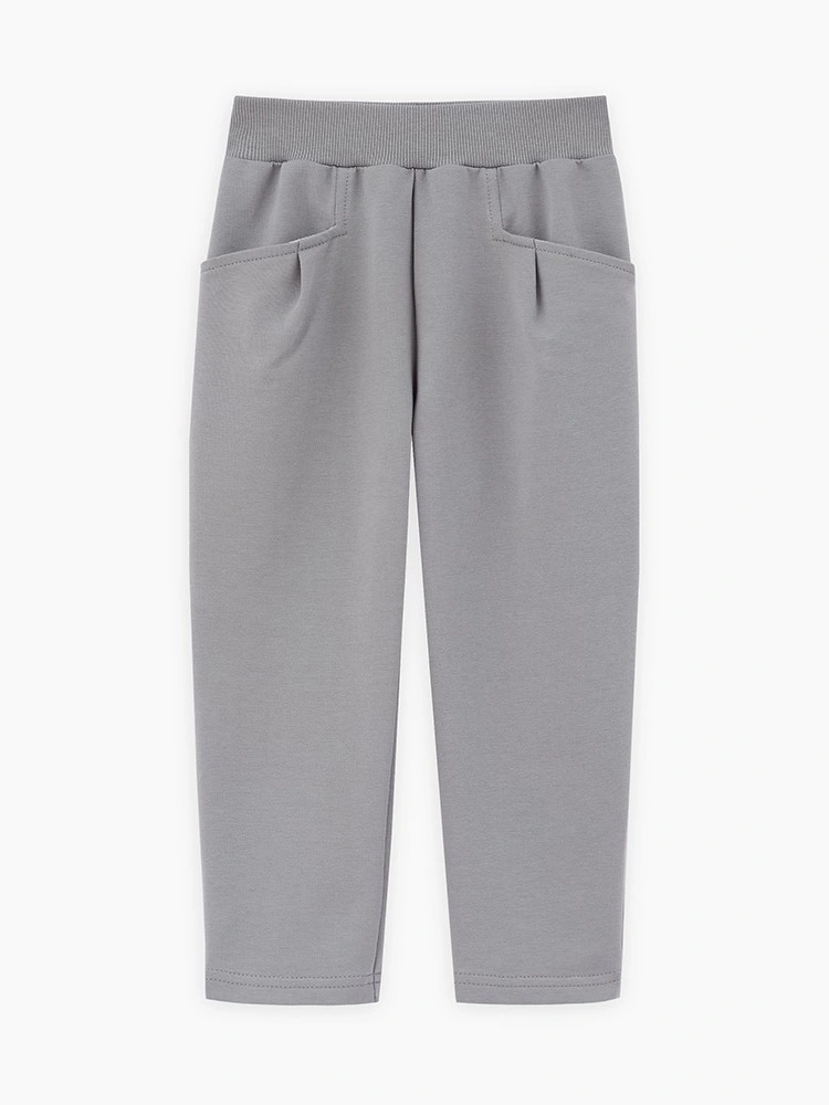 Прямые брюки сложного серо-зелёного оттенка для девочки. Модель расслабленного силуэта, со средней посадкой. Изделие без застёжки, на мягком поясе из эластичной рибаны. Брюки дополнены карманами и декоративными складками.