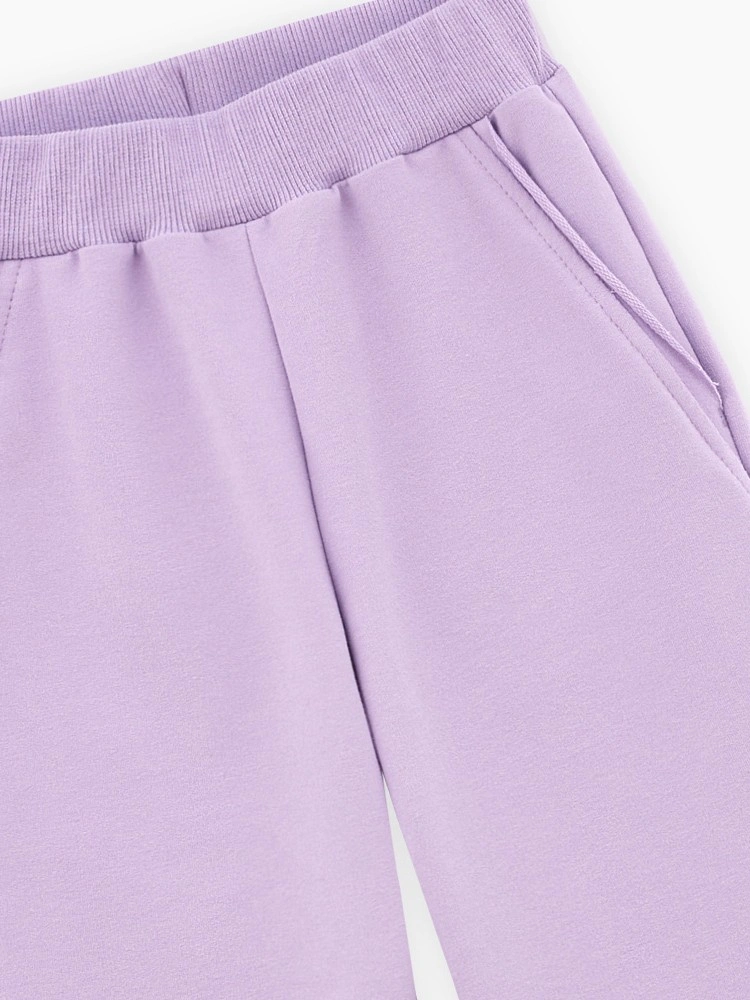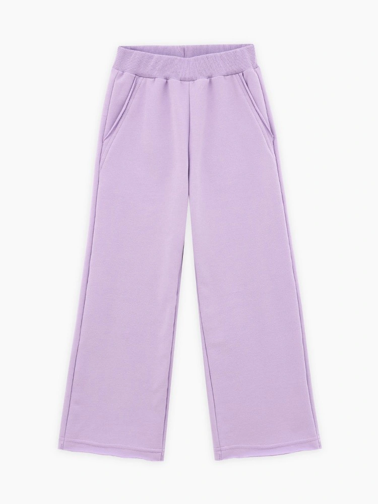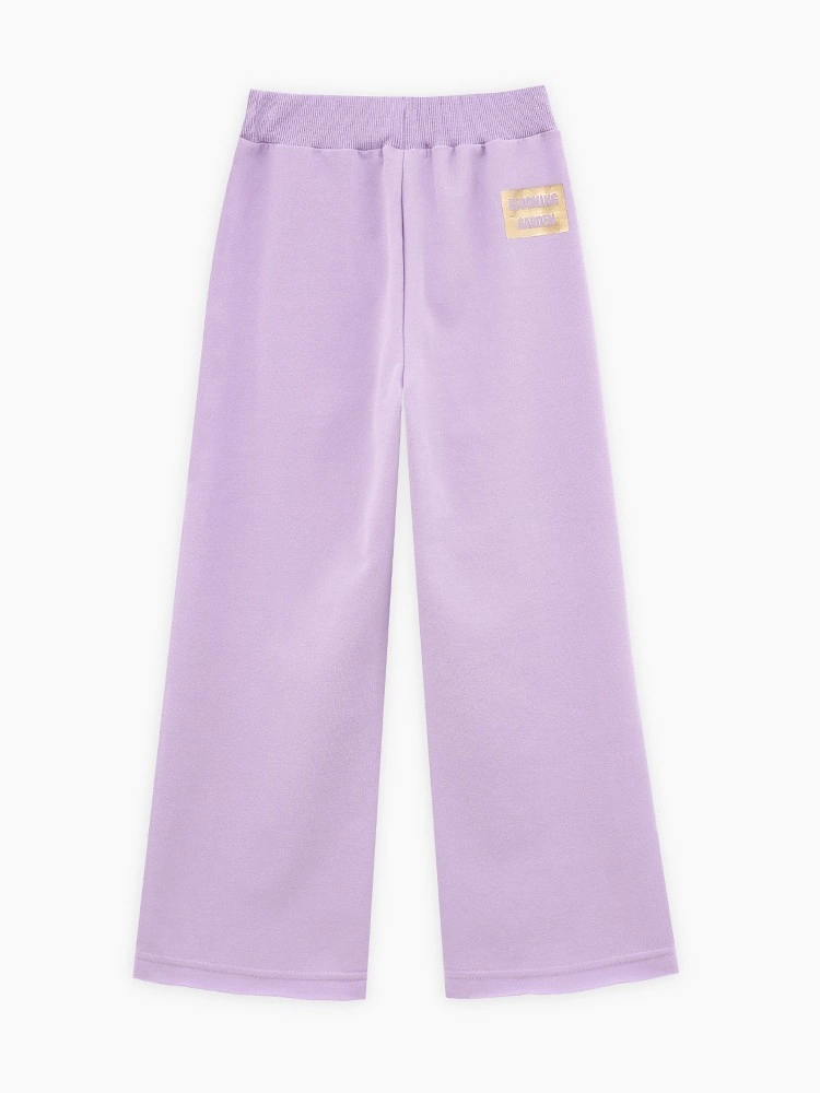 Комфортные широкие брюки лилового оттенка для девочки. Модель прямого силуэта. Изделие на мягком эластичном поясе, со средней посадкой. Брюки из тактильно приятного футера. Модель с сырым срезом по низу и карманам. Авторская печать сзади.
