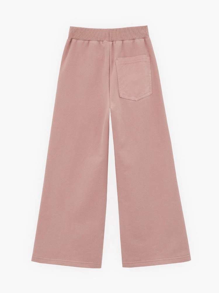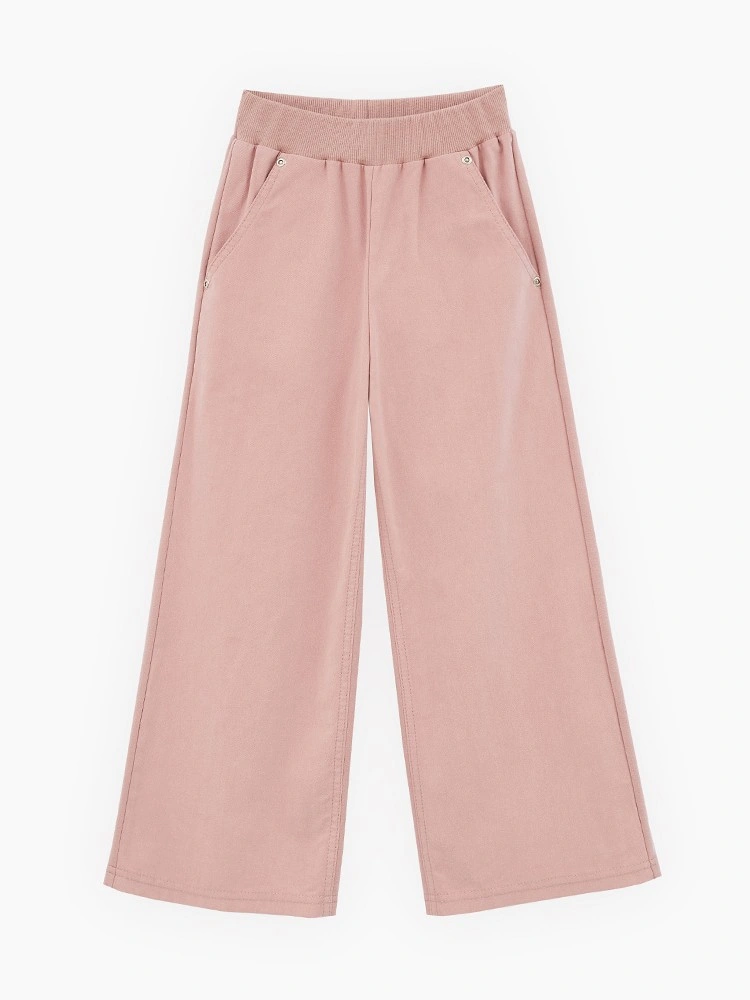 Стильные пепельно-розовые брюки для девочки. Модель прямого силуэта. Изделие на мягком эластичном поясе. Комбинация материалов: твил и тактильно приятный футер. Брюки дополнены карманами хулиганами спереди и накладным сзади. Отделка декоративной строчкой.