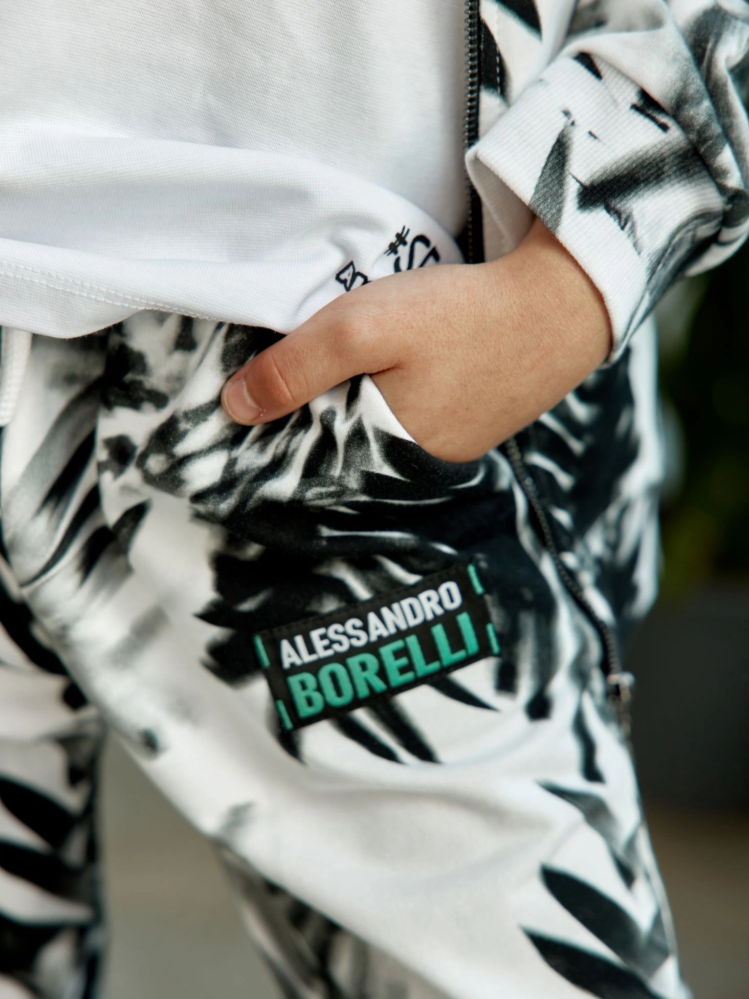 Брюки джоггеры ALESSANDRO BORELLI для мальчиков имеют глубокие карманы, манжеты, пояс на резинке, также для фиксации на талии есть шнурок. Основу дизайна составляет насыщенный абстрактный черно-белый принт в виде тропических листьев. Дополнительно модель украшена нашивкой с надписью Alessandro Borelli. Каждый элемент данной модели продуман до мелочей, как и вся коллекция Tropical. Джоггеры выполнены из качественной ткани с большим добавлением хлопка, они идеальны для активного отдыха или повседневной носки. За ними не нужен строгий уход, а после стирки ткань не замнется и не потеряет цвет.