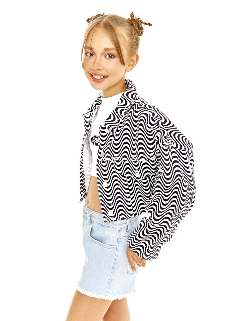 Джинсовая куртка ALESSANDRO BORELLI для девочек – идеальный выбор для вашего ребенка. Модель выполнена в стиле LOVE VIBES, коллекции, которая посвящена вибрациям любви и круговороту добра в нашем мире. Она привлечет внимание всех окружающих. Укороченная модель обладает застежкой на болты, манжетами, отложным воротником, а также накладными карманами на груди. Она хорошо сочетается как с другой одеждой из коллекции, так и с любой футболкой или джинсами. Куртка выполнена из качественной хлопковой ткани, которая не стесняет ребенка и позволяет отдыхать или просто гулять с комфортом. За ней не нужно постоянно ухаживать, после стирки ткань не выцветает и не заламывается. В каталоге представлены модели от 6 до 16 лет.