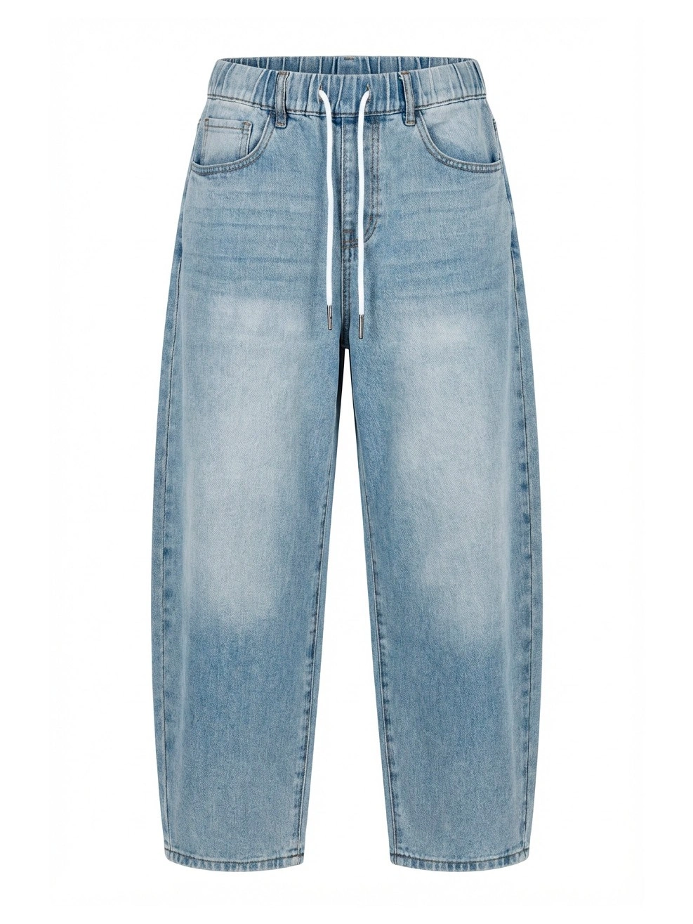 Широкие джинсы-баллон для мальчика в актуальном streetwear-стиле — идеальный выбор для тех, кто ценит комфорт и современный образ. Модель выполнена из легкого денима светло-голубого цвета с эффектом потёртости и выбеленными участками, что придаёт вещи трендовый винтажный характер. Пояс на широкой резинке со шнурком-кулиской обеспечивает комфортную посадку без застёжки — джинсы легко надеваются и не давят на живот даже при активном движении. Свободный крой с округлёнными бёдрами и зауженным низом создаёт характерный силуэт баллон, который сейчас на пике популярности. Классические карманы спереди и сзади делают модель практичной для повседневной носки.