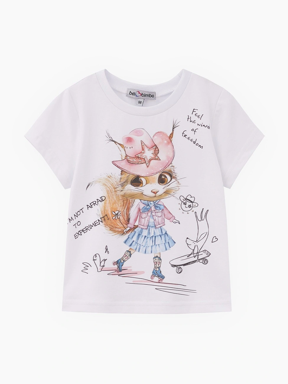 Дизайнерская белая футболка для девочки. Прямая модель. Эластичная горловина. Футболка с авторским принтом декорирована стразами.