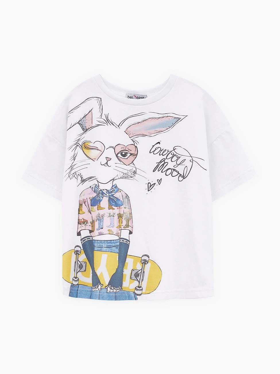 Дизайнерская белая футболка для девочки. Прямая объёмная модель. Спущенная линия плеча. Эластичная горловина. Футболка с авторским принтом декорирована стразами.