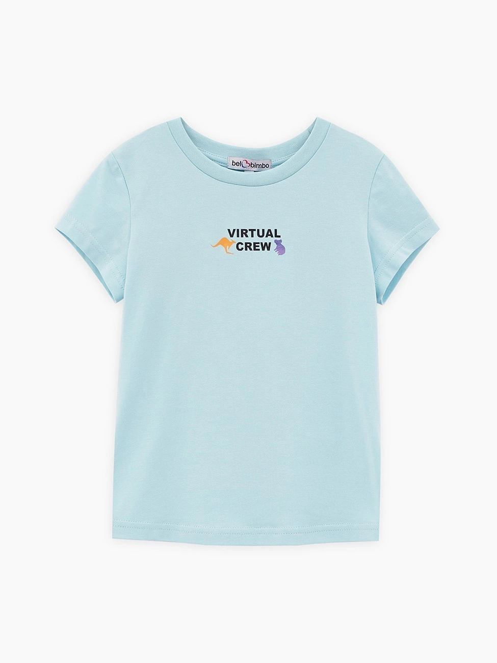 Дизайнерская футболка светло-бирюзового оттенка для девочки. Модель прямого силуэта. Эластичная горловина. Футболка декорирована авторскими принтами.