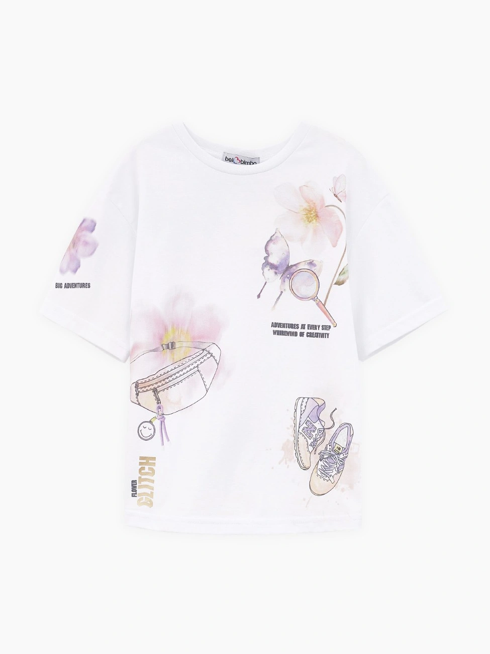 Дизайнерская белая футболка для девочки. Прямая модель. Спущенная линия плеча. Эластичная горловина. Футболка с авторским принтом декорирована стразами.