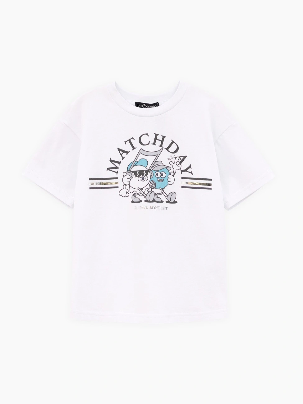 Дизайнерская белая футболка для мальчика. Прямая модель. Спущенная линия плеча. Эластичная горловина. Футболка декорирована авторским принтов с блеском.