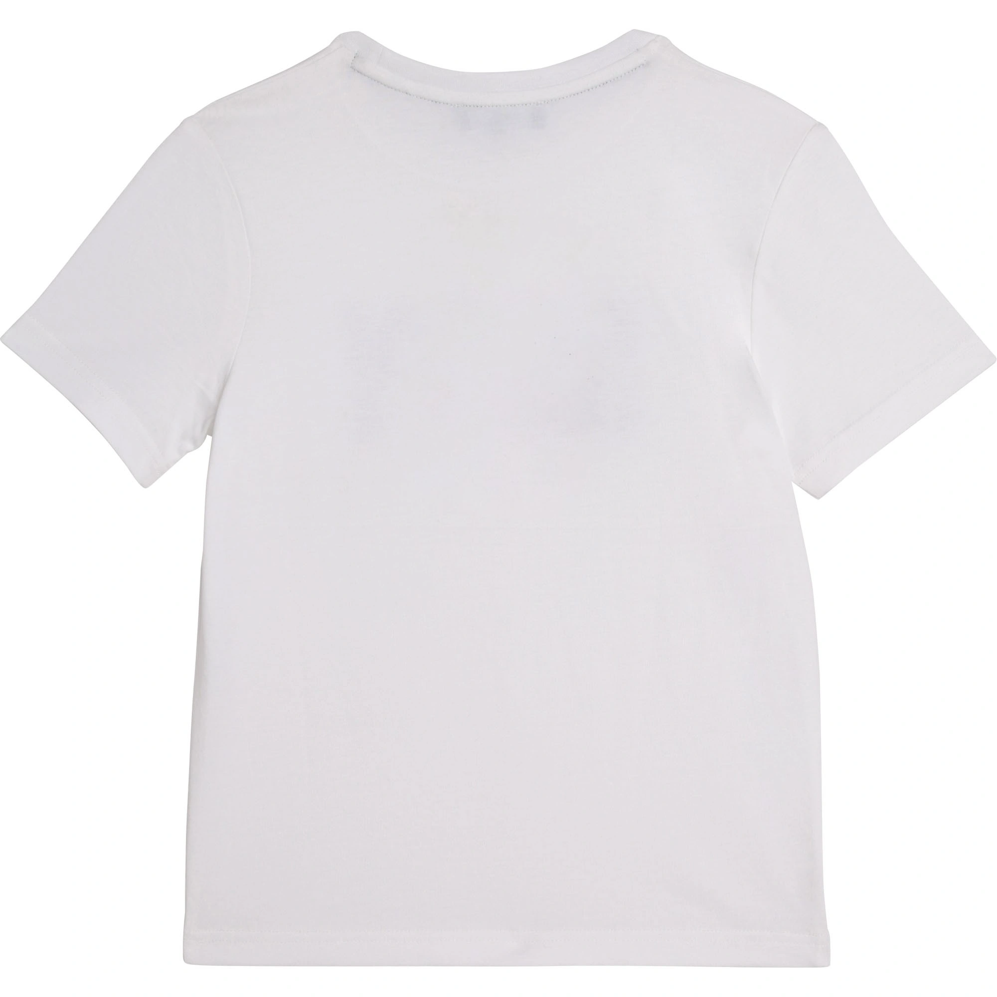 Принт с логотипом на груди, круглый вырез, короткие рукава и прямой подол. Цвет: белый.