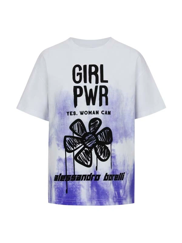 Футболка ALESSANDRO BORELLI для девочки идеально сочетается как с другими моделями из коллекции Violet, так и с базовыми джинсами или шортами. Модель свободного кроя выполнена в стиле casual. Основной цвет футболки — белый, с переходами акварельного синего оттенка, создающими эффект градиента. На передней части футболки расположен яркий бархатный принт с надписями: "GIRL PWR" и "YES. WOMAN CAN". Также изображен абстрактный цветок в графическом черном стиле с эффектом потеков краски. В нижней части нанесено название бренда "Alessandro Borelli". Приятная ткань с большим добавлением хлопка делает футболку с коротким рукавом лучшим вариантом для любого сезона. Строго ухода она не требует: после стирки рисунок останется таким же ярким. В ней можно смело гулять, отдыхать или заниматься спортом.