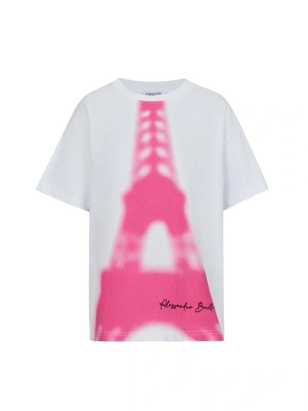 Футболка ALESSANDRO BORELLI для девочки идеально сочетается как с другими моделями из коллекции Ballet, так и с базовыми джинсами или шортами. Модель свободного кроя выполнена в стиле casual. На передней части изображен яркий розовый принт, напоминающий силуэт Эйфелевой башни, с добавлением художественного эффекта размытости. В нижней части нанесена бархатная стилизованная подпись Alessandro Borelli. Приятная ткань с большим добавлением хлопка делает футболку с коротким рукавом лучшим вариантом для любого сезона. Строго ухода она не требует: после стирки рисунок останется таким же ярким. В ней можно смело гулять, отдыхать или заниматься спортом.