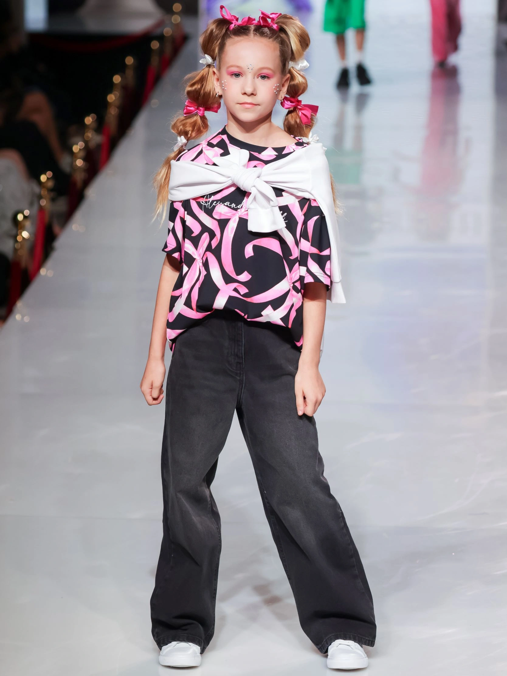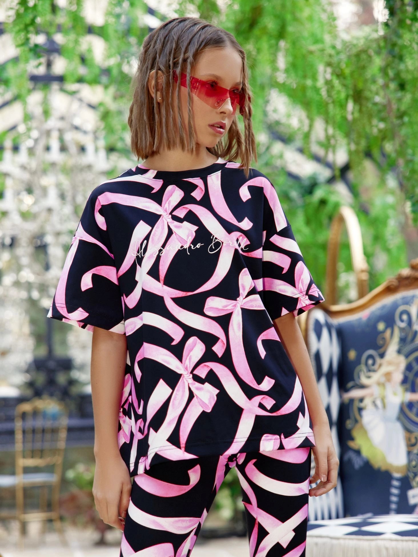 Футболка ALESSANDRO BORELLI для девочки идеально сочетается как с другими моделями из коллекции Ballet, так и с базовыми джинсами или шортами. Основа модели чёрного цвета, а её поверхность украшена эффектным принтом в виде розовых лент и бантов, который добавляет современный акцент. Футболка свободного кроя выполнена в стиле casual. Приятная ткань с большим добавлением хлопка делает футболку с коротким рукавом лучшим вариантом для любого сезона. Строго ухода она не требует: после стирки принт останется таким же ярким. В ней можно смело гулять, отдыхать или заниматься спортом.