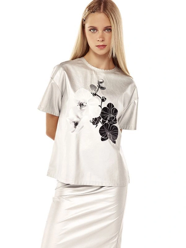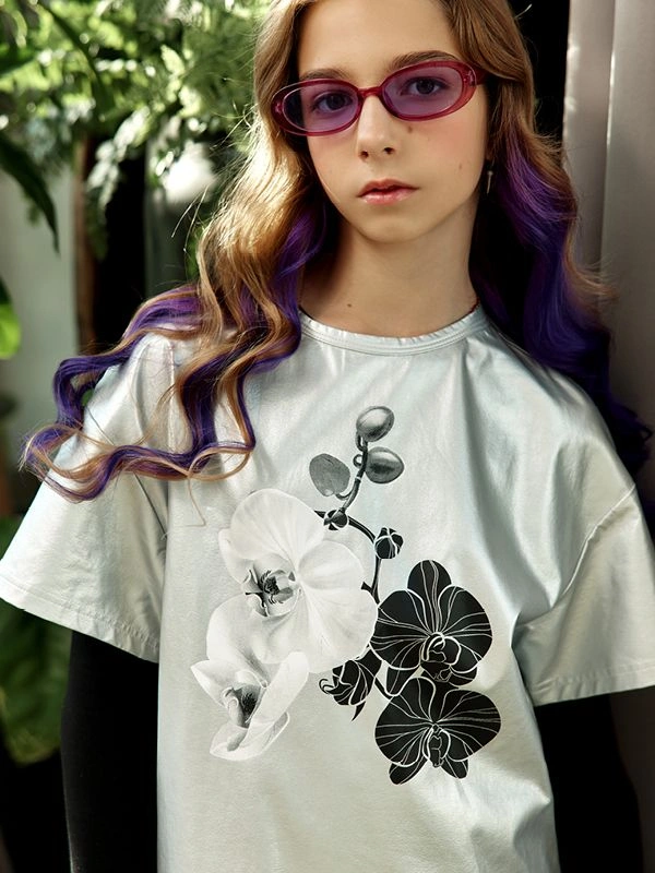 Футболка ALESSANDRO BORELLI для девочки идеально сочетается как с другими моделями из коллекции Orchid, так и с базовыми джинсами или шортами. Модель выполнена в серебристом цвете и украшена изящным цветочным принтом. Дизайн сочетает в себе крупные белые и черные орхидеи, добавляя ей утонченности и шарма. Свободный крой обеспечивает комфорт, а качественная ткань долговечность. В футболке с коротким рукавом можно смело гулять или посещать мероприятия.