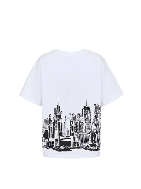 Футболка ALESSANDRO BORELLI для девочки представлена в стиле коллекции Orchid с динамичным городским принтом. Основной цвет – черно-белый с изображением городских небоскрёбов, создающим эффект энергии большого города. На передней части футболки размещена надпись "THE CITY NEVER SLEEP". Приятная ткань с большим добавлением хлопка делает футболку с коротким рукавом лучшим вариантом для любого сезона. Строго ухода она не требует: после стирки рисунок останется таким же ярким. В ней можно смело гулять, отдыхать или заниматься спортом.