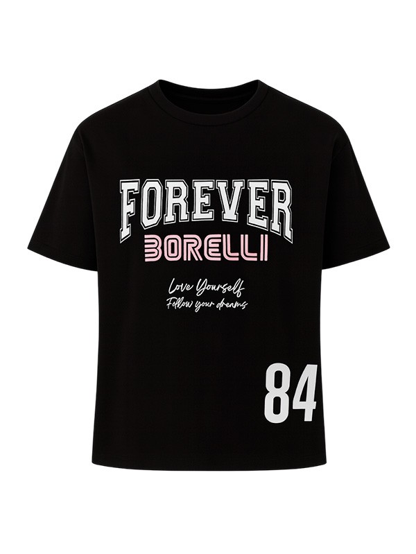 Стильная черная футболка свободного кроя с принтом в университетском стиле. Спереди расположена надпись FOREVER BORELLI в объемных буквах с контрастной отделкой и мотивационной фразой Love Yourself — Follow your dreams. В нижней части добавлен декоративный номер «84», придающий спортивный акцент. Модель выполнена из качественной хлопковой ткани, хорошо держит форму и не теряет цвет после стирки. Универсальный дизайн легко сочетается с джинсами, шортами и юбками, создавая модный и комфортный образ на каждый день.