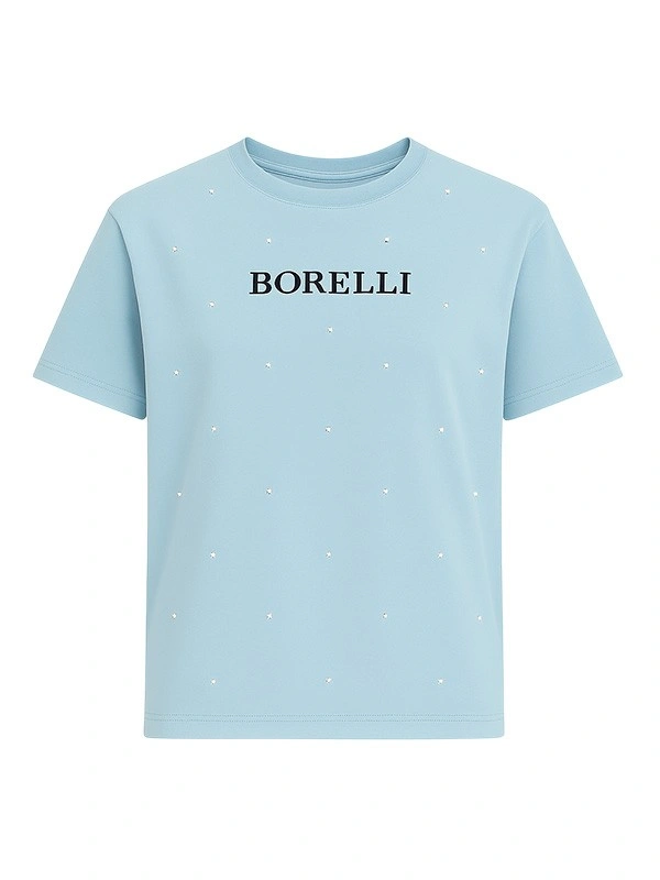 Футболка для девочки Alessandro Borelli — лаконичная и утончённая модель для тех, кто ценит элегантный минимализм. Изготовлена из мягкого хлопкового трикотажа премиум-качества, приятного к телу и обеспечивающего комфорт в течение всего дня. Голубой оттенок дополнен деликатными рассыпанными стразами, создающими эффект лёгкого сияния. На груди — лаконичная надпись BORELLI в классическом шрифте, подчёркивающая стиль и фирменный характер бренда.