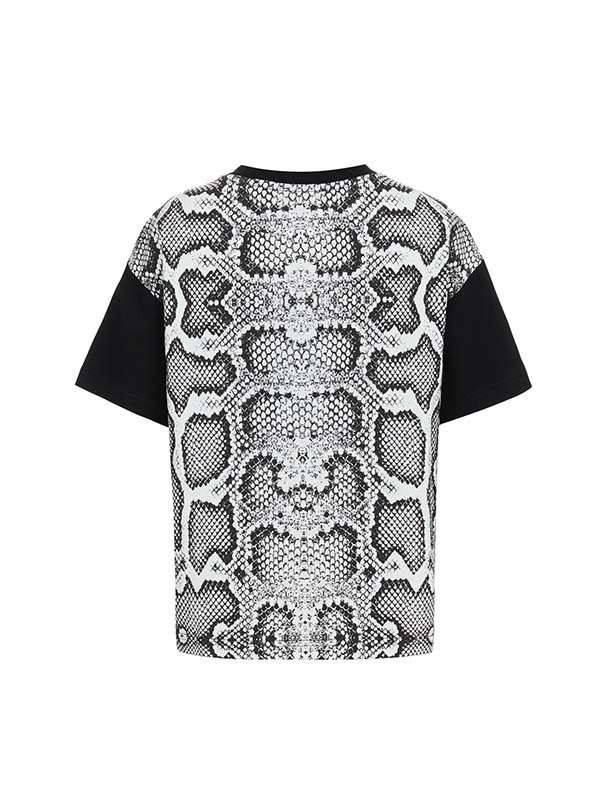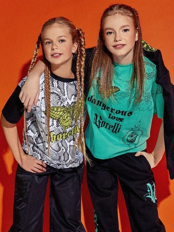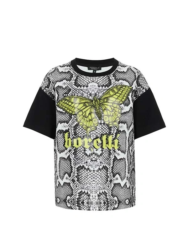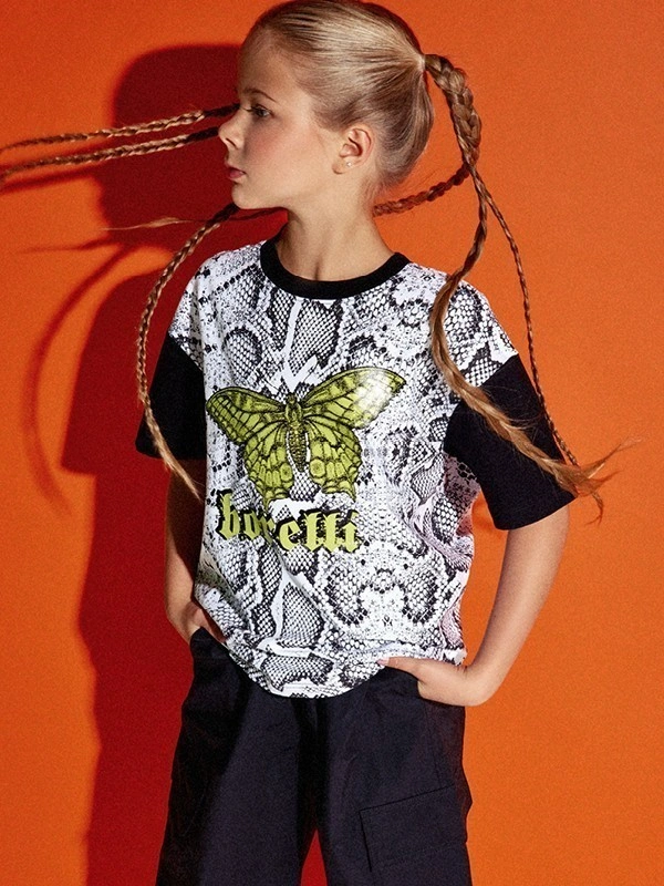 Футболка ALESSANDRO BORELLI для девочки идеально сочетается как с другими моделями из коллекции Snakes, так и с базовыми джинсами или шортами. Модель выполнена из черно-белой ткани с узором, напоминающим змеиную кожу, на которой выделяется крупный зеленый рисунок бабочки и надпись " borelli". Приятная ткань с большим добавлением хлопка делает футболку с коротким рукавом лучшим вариантом для любого сезона. Строго ухода она не требует: после стирки рисунок останется таким же ярким. В ней можно смело гулять, отдыхать или заниматься спортом.