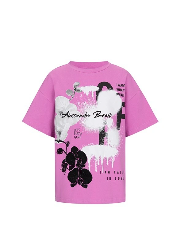 Футболка ALESSANDRO BORELLI для девочки идеально сочетается как с другими моделями из коллекции Orchid, так и с базовыми джинсами или шортами. Модель выполнена в розовом цвете с контрастным принтом. На передней части расположены черные и серые орхидеи, крупные буквы и элементы ярко-белого цвета, создающие эффект краски, которая будто стекает. Надписи разнообразны и добавляют стиль, включая фразу "I am falling in love". Приятная ткань с большим добавлением хлопка делает футболку с коротким рукавом лучшим вариантом для любого сезона. Строго ухода она не требует: после стирки рисунок останется таким же ярким. В ней можно смело гулять, отдыхать или заниматься спортом.