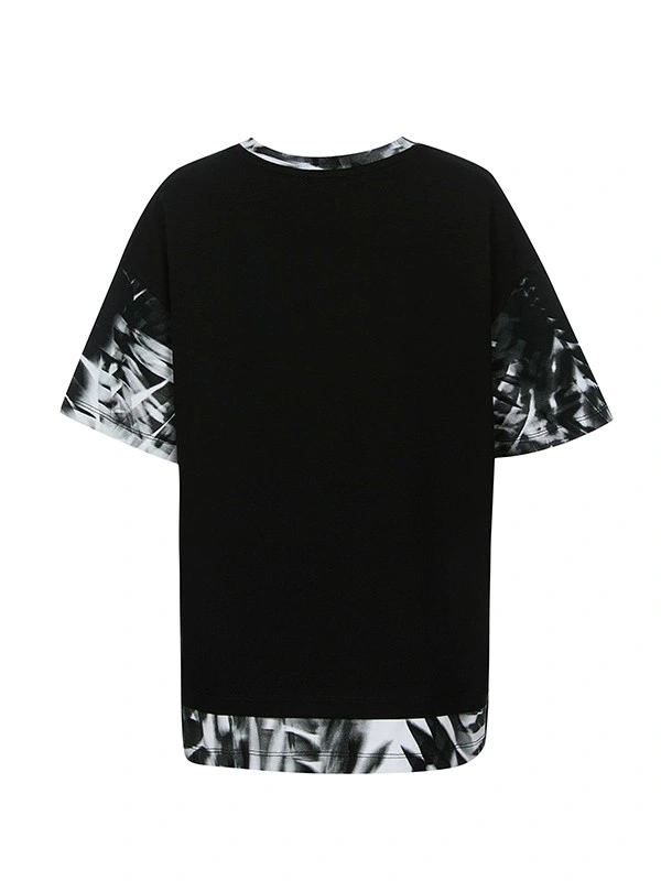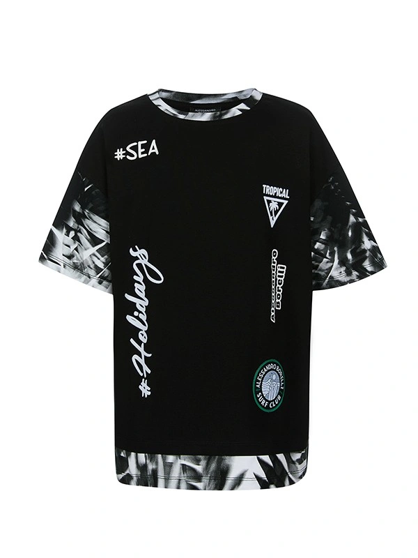 Футболка ALESSANDRO BORELLI для мальчика – лучший выбор для лета и теплой весны. Основной цвет — чёрный, украшен яркими белыми надписями и принтами, такими как "#SEA", "#Holidays", "Tropical" и другие декоративные элементы с тематикой отпуска и серфинга. Рукава и нижняя часть футболки имеют контрастную вставку с абстрактным чёрно-белым принтом, создающим эффект пальмовых листьев. Круглый вырез горловины и короткие рукава добавляют удобства, а также позволяют свободно двигаться. Модель выполнена из качественной хлопковой ткани, которая долго сохраняет свою яркость и не выцветает после стирки. Футболка будет хороша для прогулок, отдыха или занятий спортом. Прекрасно сочетается как с любой одеждой из коллекции Tropical, так и с другими моделями.