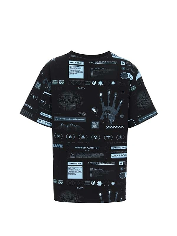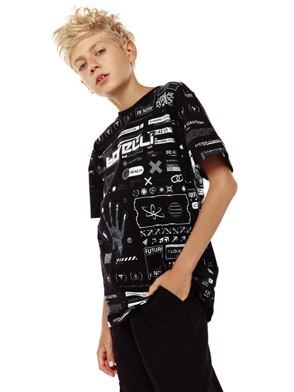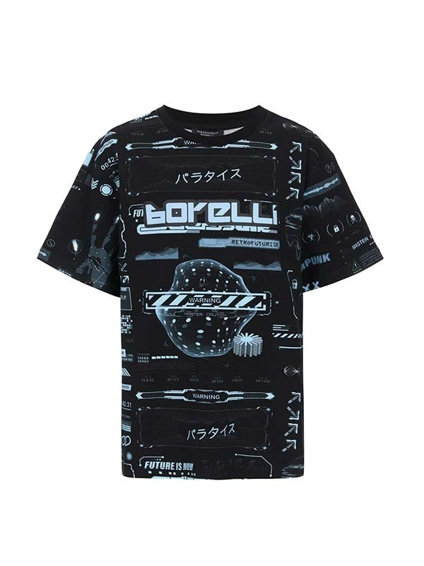 Футболка ALESSANDRO BORELLI для мальчика выполнена в глубоком черном цвете. Она идеально сочетается как с другими моделями из коллекции Cyberpunk, так и с базовыми джинсами или шортами. Приятная ткань с большим добавлением хлопка делает футболку лучшим вариантом для любого сезона. Строго ухода она не требует: после стирки рисунок останется таким же ярким. На всей поверхности изображены крупные графические принты в стиле киберпанк с элементами технологии и футуристической архитектуры. Футболка имеет классический крой с круглым вырезом и короткими рукавами, что делает её комфортной для повседневной носки.