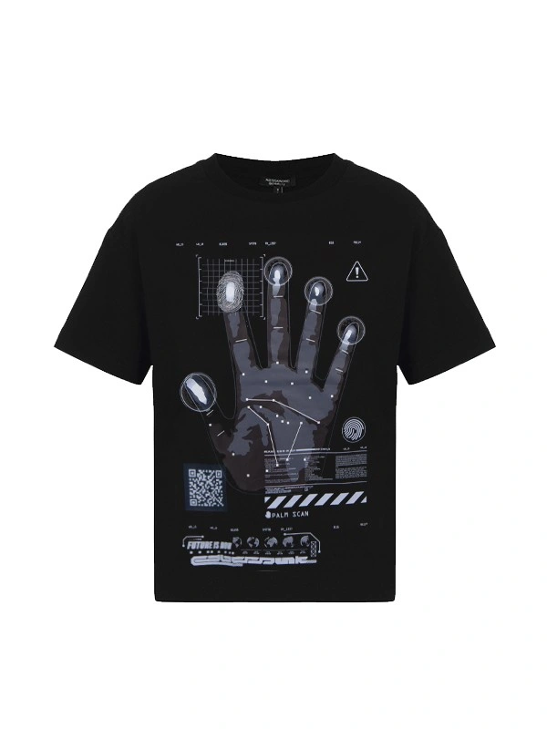 Футболка ALESSANDRO BORELLI для мальчика идеально сочетается как с другими моделями из коллекции Cyberpunk, так и с базовыми джинсами или шортами. На передней части изображен стильный принт с силуэтом ладони, окруженной различными графическими элементами, напоминающими футуристический интерфейс или сканер. Принт выполнен в оттенках белого и серого, что создает технологичную атмосферу, а также на футболке присутствуют QR-код и надписи, добавляющие ей современный вид. Приятная ткань с большим добавлением хлопка делает футболку с коротким рукавом лучшим вариантом для любого сезона. Строго ухода она не требует: после стирки рисунок останется таким же ярким. В ней можно смело гулять, отдыхать или заниматься спортом.
