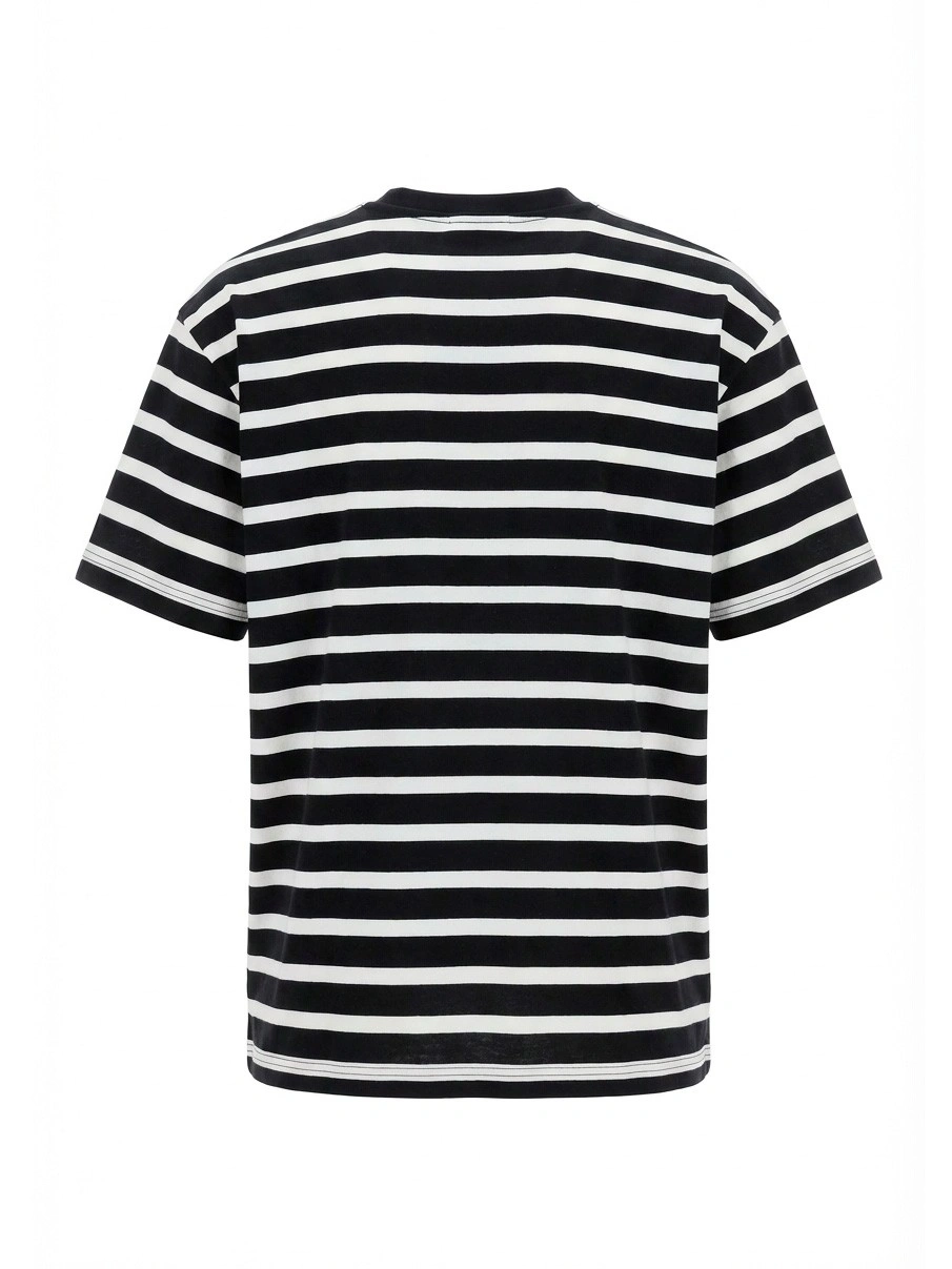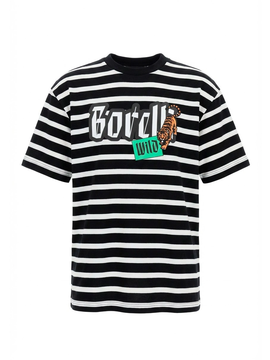 Черно-белая футболка Borelli с тигром для мальчиков. Стильная футболка в классическую черно-белую горизонтальную полоску выполнена из мягкого хлопкового трикотажа с круглым вырезом и короткими рукавами. На груди — эффектный принт с надписями "Borelli" и "WILD" белыми буквами на зеленом фоне, дополненный изображением оранжевого тигра. Сочетание полосок и яркого принта создает динамичный городской образ. Универсальная футболка отлично сочетается с джинсами, шортами и спортивными брюками. Качественный материал обеспечивает комфорт.