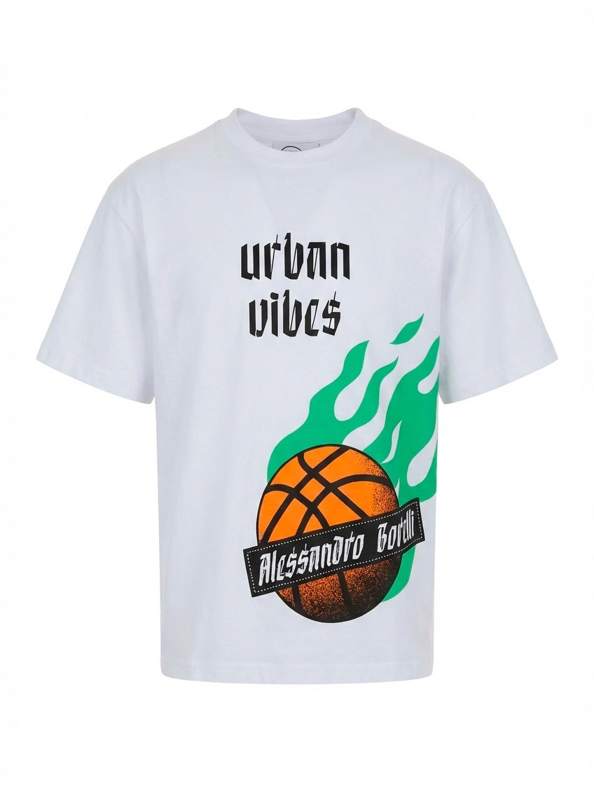 Белая футболка Alessandro Borelli с баскетбольным принтом для мальчиков. Стильная футболка белого цвета с ярким спортивным дизайном выполнена из мягкого хлопкового трикотажа с классическим круглым вырезом и короткими рукавами. Эффектный принт в стиле Urban Vibes с изображением баскетбольного мяча в зеленом пламени. Надпись "urban vibes" черными буквами и логотип бренда Alessandro Borelli создают динамичную городскую композицию. Идеальный выбор для любителей баскетбола и уличного стиля. Отлично сочетается с джинсами, шортами и спортивными брюками. Качественный материал обеспечивает комфорт и долговечность.