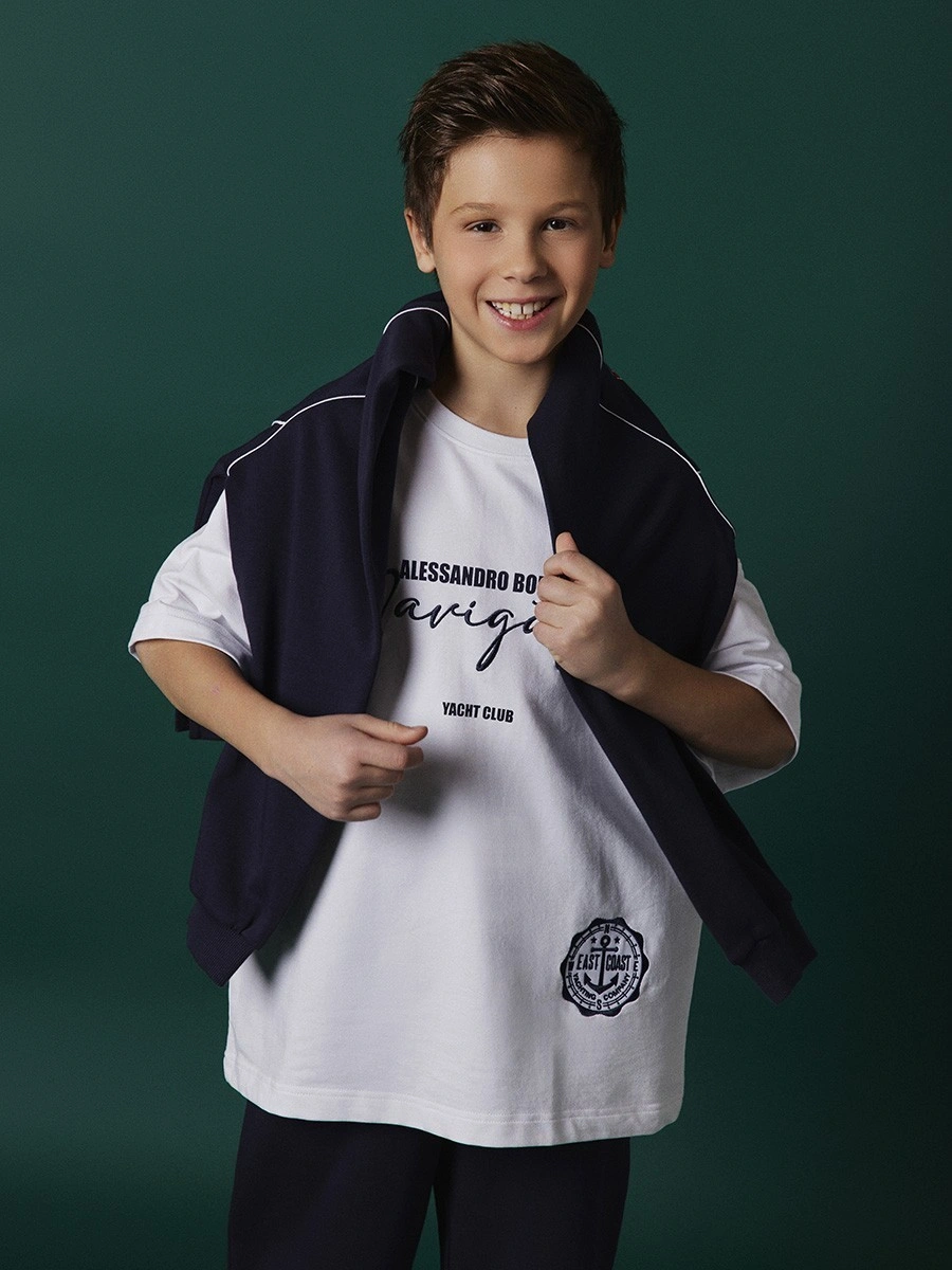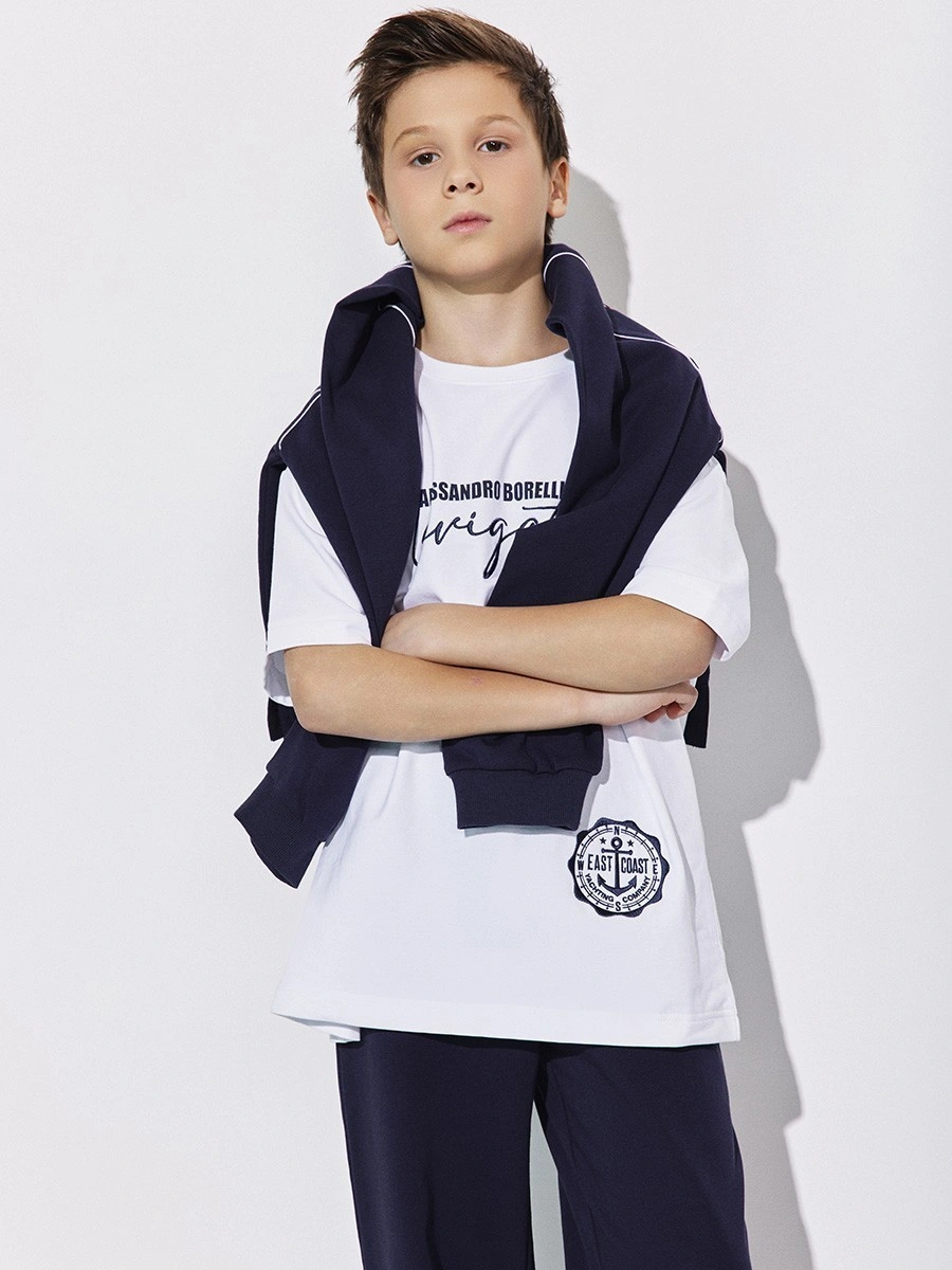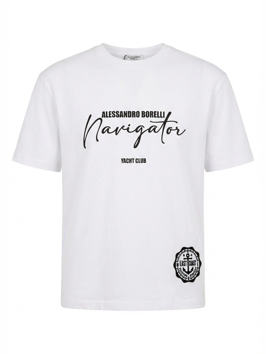 Белая футболка Alessandro Borelli в морском стиле для мальчиков. Элегантная футболка белого цвета с морской тематикой. Модель выполнена из качественного хлопкового трикотажа с классическим круглым вырезом и короткими рукавами. Стильный дизайн в морском стиле: надпись "ALESSANDRO BORELLI" печатными буквами вверху, крупная надпись "Navigator" элегантным курсивом по центру и "YACHT CLUB" внизу. Все надписи выполнены в темно-синем цвете. Справа внизу — эмблема "EAST COAST" с якорем в круглой рамке. Универсальная базовая футболка для летнего гардероба. Отлично сочетается с шортами, брюками и джинсами. Качественный материал обеспечивает комфорт в жаркую погоду.