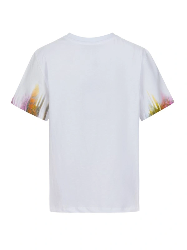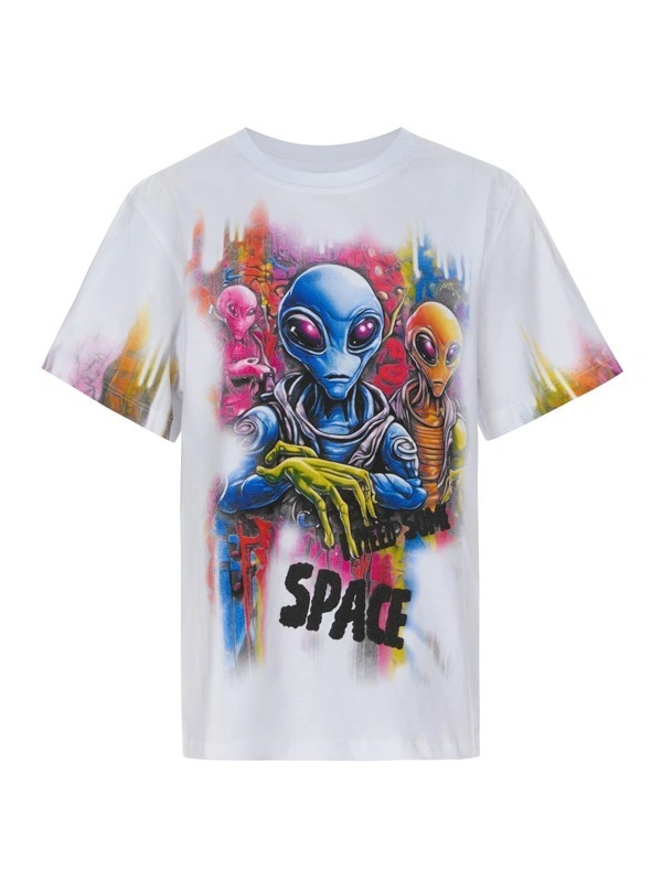 Футболка ALESSANDRO BORELLI для мальчика выполнена в белом цвете. Круглый вырез горловины и короткие рукава добавляют удобства, а также позволяют свободно двигаться. На передней части изделия изображены инопланетяне в стиле граффити — синие, розовые и жёлтые, с выразительными глазами и необычными деталями, придающими изображению футуристическую атмосферу. Под изображением можно заметить слово "SPACE", выполненное в стиле уличного искусства. Футболка будет удобна для прогулок или занятий спортом. Модель выполнена из приятного к телу материала с большим добавлением хлопка. Не боится частых стирок: ткань не выцветает и не заламывается. Хорошо подойдет для активного отдыха.