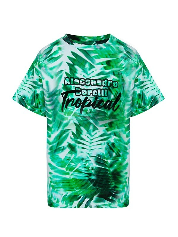 Футболка ALESSANDRO BORELLI для мальчика – лучший выбор для лета и теплой весны. Основу дизайна составляет насыщенный зелёный узор с пальмовыми листьями, создающий атмосферу лета и отдыха. На груди нанесена надпись "Alessandro Borelli Tropical" в контрастных черных шрифтах, придающая изделию модный акцент. Круглый вырез горловины и короткие рукава добавляют удобства, а также позволяют свободно двигаться. Модель выполнена из качественной хлопковой ткани, которая долго сохраняет свою яркость и не выцветает после стирки. Футболка будет хороша для прогулок, отдыха или занятий спортом. Прекрасно сочетается как с любой одеждой из коллекции Tropical, так и с другими моделями.