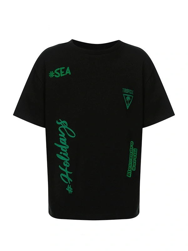 Футболка ALESSANDRO BORELLI для мальчика – лучший выбор для лета и теплой весны. Изделие украшено стильными зелеными принтами в молодежном стиле: хэштеги #SEA и #Holidays, надпись TROPICAL со схематичным изображением пальмы, а также принт Alessandro Borelli в нижней части. Круглый вырез горловины и короткие рукава добавляют удобства, а также позволяют свободно двигаться. Модель выполнена из качественной хлопковой ткани, которая долго сохраняет свою яркость и не выцветает после стирки. Футболка будет хороша для прогулок, отдыха или занятий спортом. Прекрасно сочетается как с любой одеждой из коллекции Tropical, так и с другими моделями.
