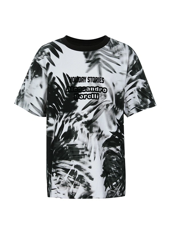 Футболка ALESSANDRO BORELLI для мальчика – лучший выбор для лета и теплой весны. Основу дизайна составляет насыщенный абстрактный черно-белый принт в виде тропических листьев. На груди размещена надпись "HOLIDAY STORIES" и имя бренда "Alessandro Borelli", выполненные в черном цвете, что придаёт изделию модный акцент. Круглый вырез горловины и короткие рукава добавляют удобства, а также позволяют свободно двигаться. Модель выполнена из качественной хлопковой ткани, которая долго сохраняет свою яркость и не выцветает после стирки. Футболка будет хороша для прогулок, отдыха или занятий спортом. Прекрасно сочетается как с любой одеждой из коллекции Tropical, так и с другими моделями.
