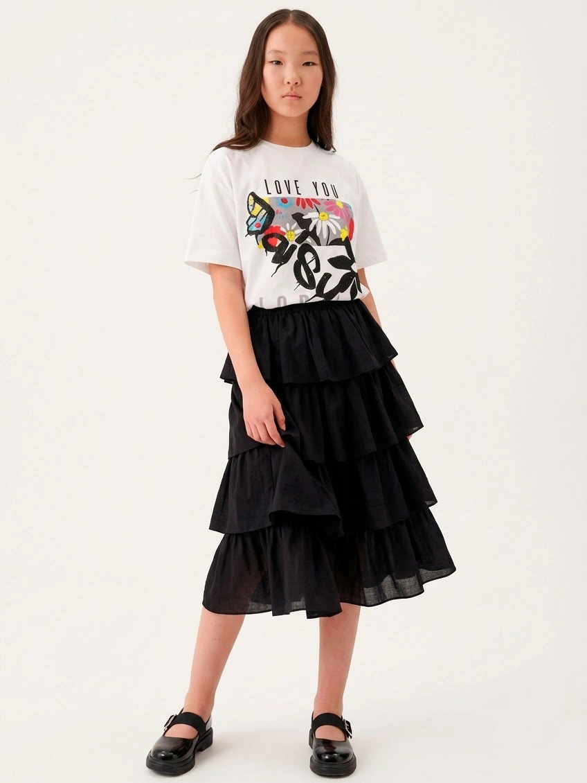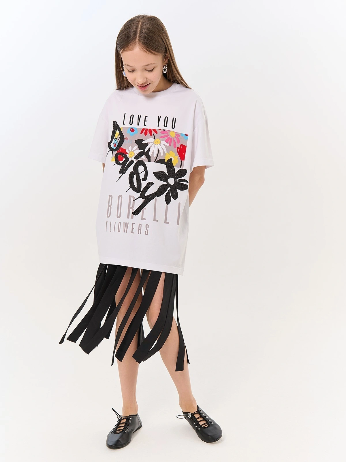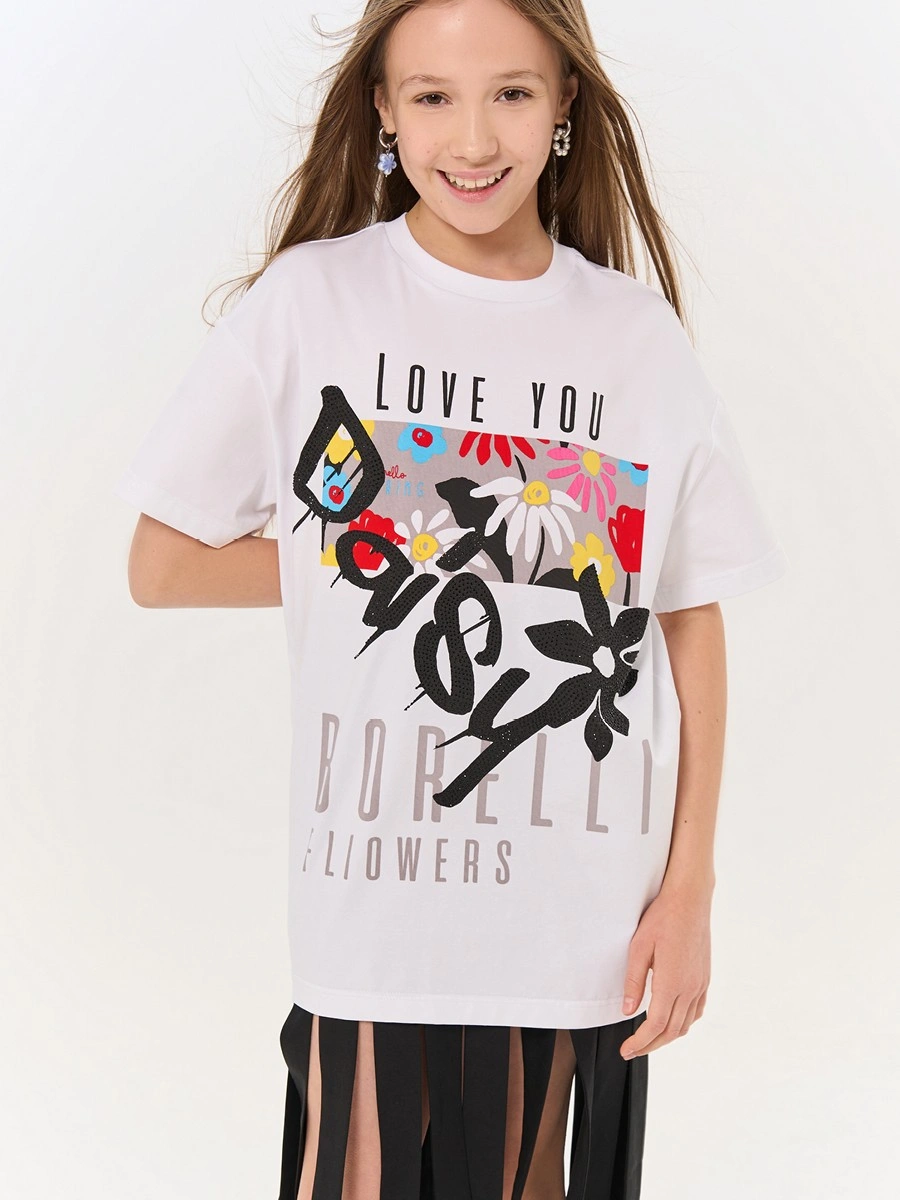 Белая футболка-туника Borelli с цветочным принтом для девочек. Стильная удлиненная футболка белого цвета выполнена из мягкого хлопкового трикотажа с классическим круглым вырезом, короткими рукавами и свободным кроем. Яркий многослойный принт сочетает надпись "LOVE YOU" вверху, красочные цветы (розовые, белые, желтые, красные) в центральном блоке и черные графичные элементы. Внизу — логотип "BORELLI FLOWERS" в пастельно-бежевых тонах. Универсальная удлиненная модель носится как самостоятельно, так и с леггинсами. Отлично сочетается с джинсами и юбками.