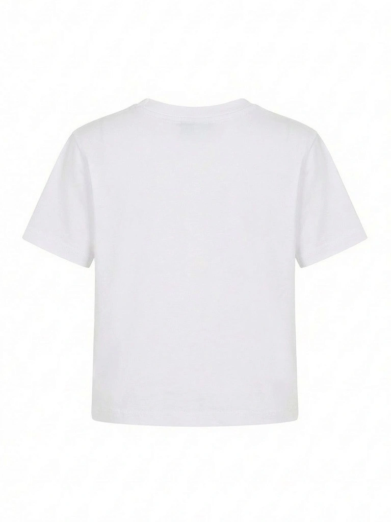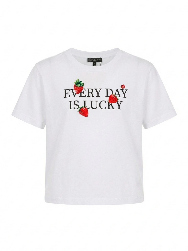 Белый укороченный топ с клубникой истразами для девочек. Стильный укороченный топ белого цвета выполнен из мягкого хлопкового трикотажа с классическим круглым вырезом и короткими рукавами. На груди — вдохновляющая надпись "EVERY DAY IS LUCKY" черными буквами, украшенная объемными аппликациями клубник с красными стразами и зелеными листиками. Блестящий декор создает эффектный акцент и праздничное настроение. Укороченный крой идеально сочетается с джинсами и юбками с высокой посадкой, шортами. Универсальная модель для создания летних образов. Качественный материал обеспечивает комфорт.