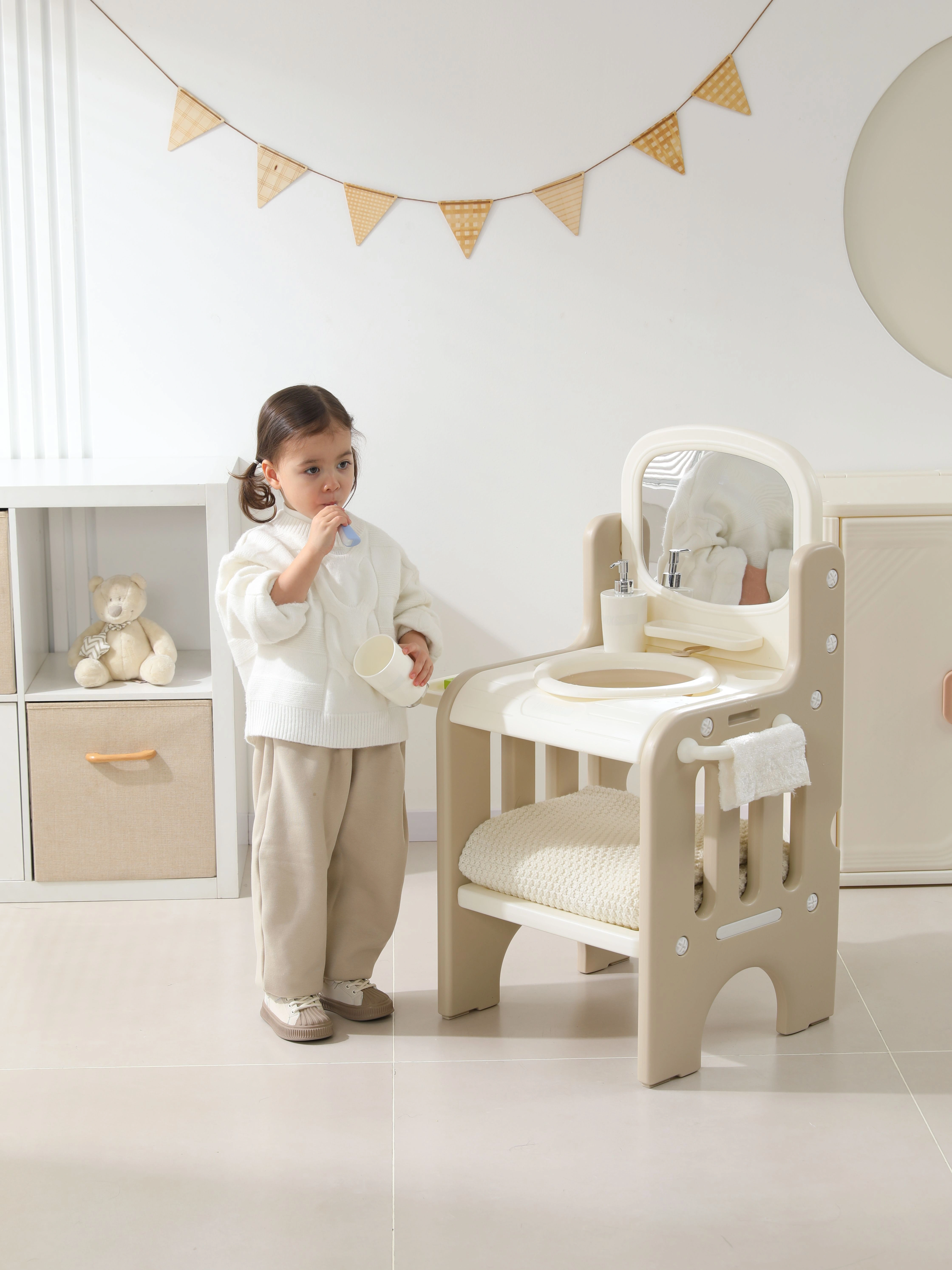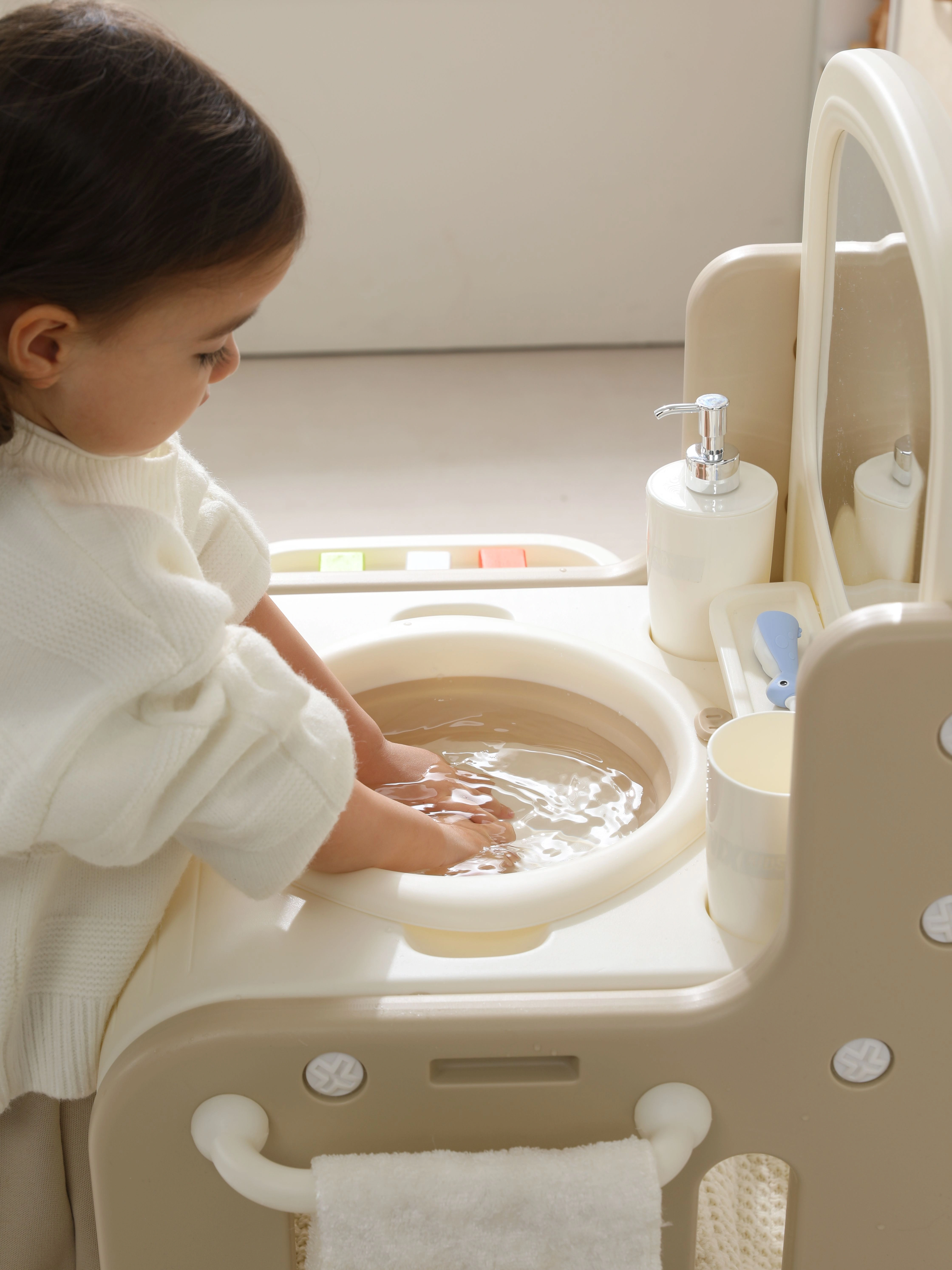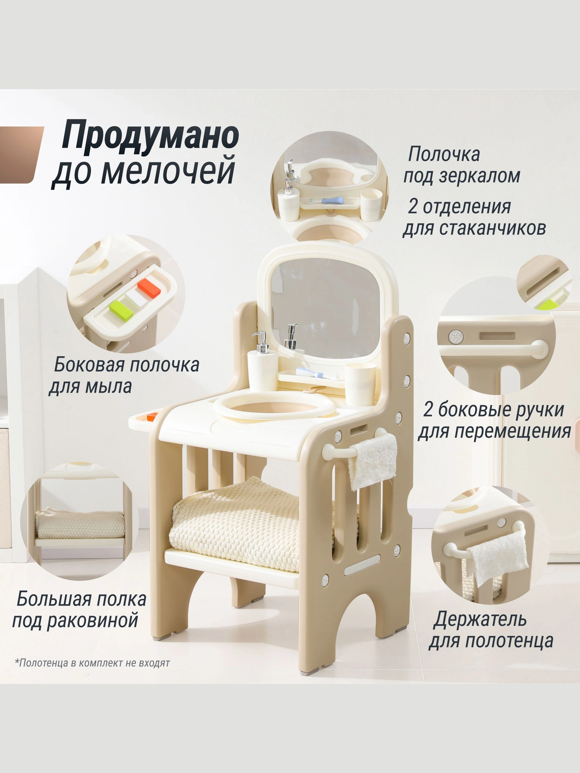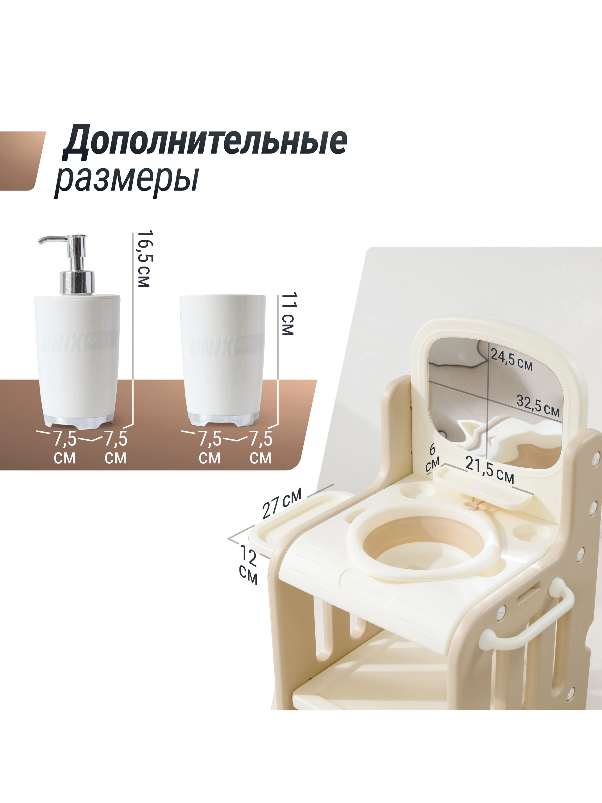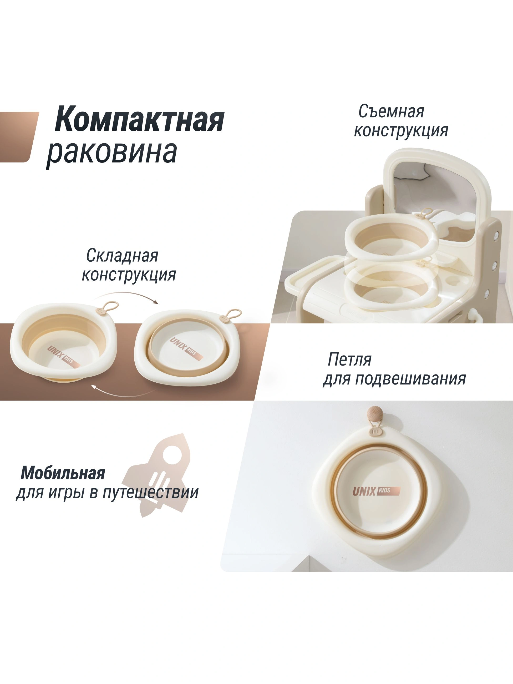 Детская развивающая игрушечная раковина UNIX Kids - прекрасный подарок для малышей. Умывальник детский разнообразит веселые игры и не оставит равнодушным ни одного юного пользователя! Маленькие исследователи известны любовью к играм с водой. Игровой умывальник можно использовать для мытья кукол или для купания игрушек. Малыш создаст свой собственный мир, ведь детская раковина может стать элементом настоящей игры в повара. Сюжетно - ролевые игры – парикмахерская для кукол или салон красоты развивают воображение, мелкую моторику и координацию, а также способствуют развитию речи, фантазии и навыков общения. Умывальник для малышей - настоящая развивающая игрушка. Игры с водой стимулируют воображение, помогая развить ребенку креативность. Рукомойник для детей Мойдодыр - прекрасный инструмент для обучения малышей, благодаря которому ребенок будет осваивать навыки личной гигиены. Пользуясь рукомойником, малыш сможет наблюдать за собой в безопасное зеркало. Аксессуары для личной гигиены – стаканчик для зубных щеток и мыла сделаны из качественных материалов. Продуман держатель для полотенец и открытая полочка под раковиной для игрушек, куда можно сложить детские вещи, игровые принадлежности и полотенца. Благодаря реалистичным аксессуарам, обучение ненавязчиво превратится в игру. Как и вся продукция UNIX Kids, раковина детская для игр с водой изготовлена из пищевого пластика и имеет сертификацию. Пищевой пластик гипоаллергенен, не имеет запаха и абсолютно безопасен для маленьких пользователей. Детский умывальник не подвержен UV-излучению, поэтому игрушка не выгорит на солнце и не потеряет свой цвет. Раковина с водой снимается со стойки и прекрасно моется, поэтому подходит для использования, как дома, так и на улице. Вы сможете брать ее с собой в дальние поездки, чтобы развлечь вашего непоседу. Сглаженные углы выполнены с большим вниманием к безопасности малыша. На ножках имеется специальное противоскользящее покрытие. Надежные шурупы помещены в углубления, не давая раскрутить их маленьким ручкам. Напольная детская раковина обладает небольшим весом и компактными размерами 46 х 43 х 92 см, благодаря чему ее легко перемещать. Развивающая игрушка UNIX Kids доставит вашему малышу бесконечное удовольствие в играх и обучении, подойдет для ванной и поможет в процессе обучения чистки зубов и умывания. Благодаря детскому умывальнику, ребенок почувствует себя, маленьким взрослым. Детский умывальник прекрасно впишется в обстановку детского сада, детской площадки, дачи, квартиры или дома. Это прекрасный подарок на день рождение, Новый год девочке и мальчику, внуку или внучке. С таким подарком, любой праздник станет незабываемым событием и сделаете малыша еще более счастливым!