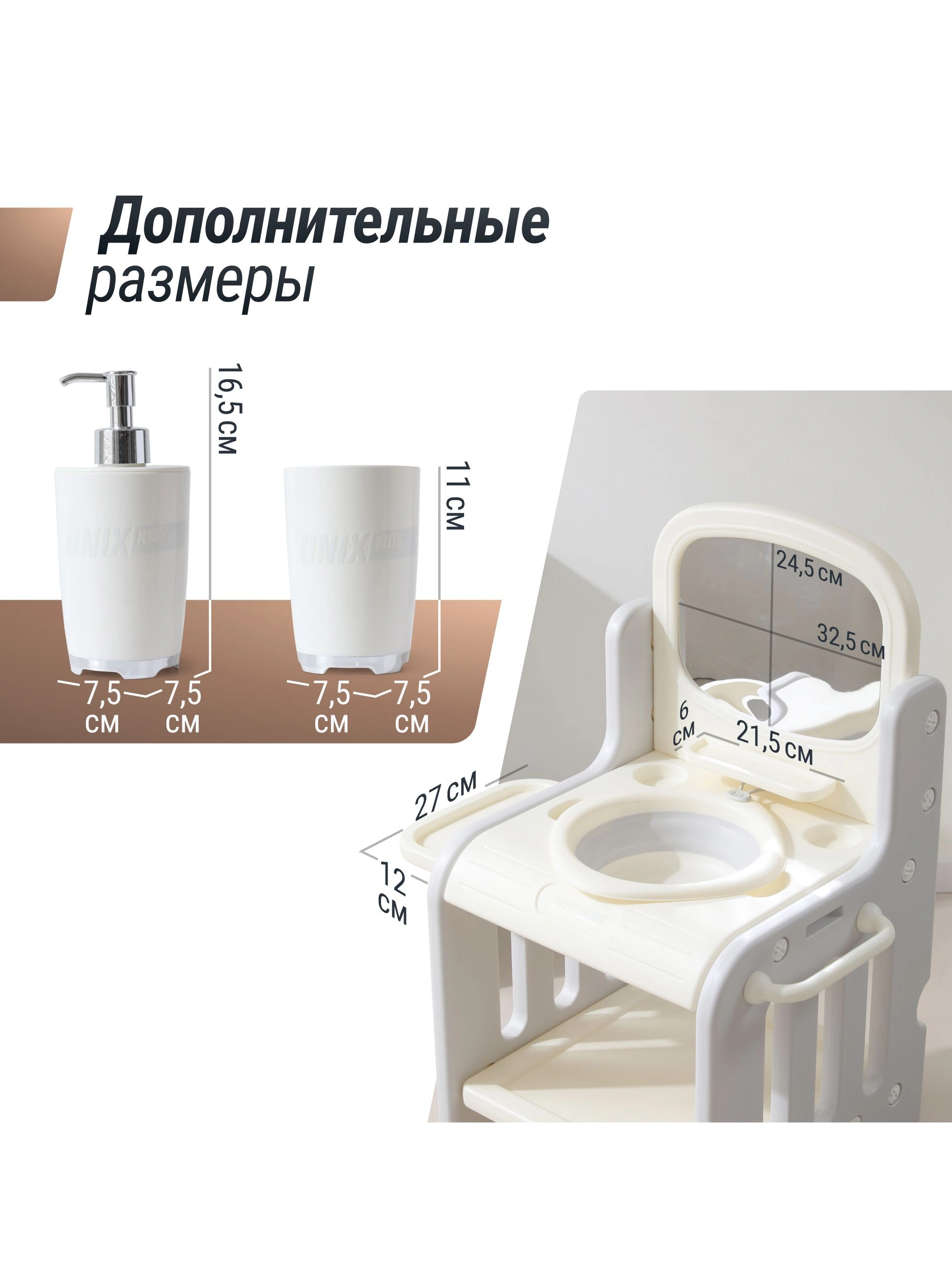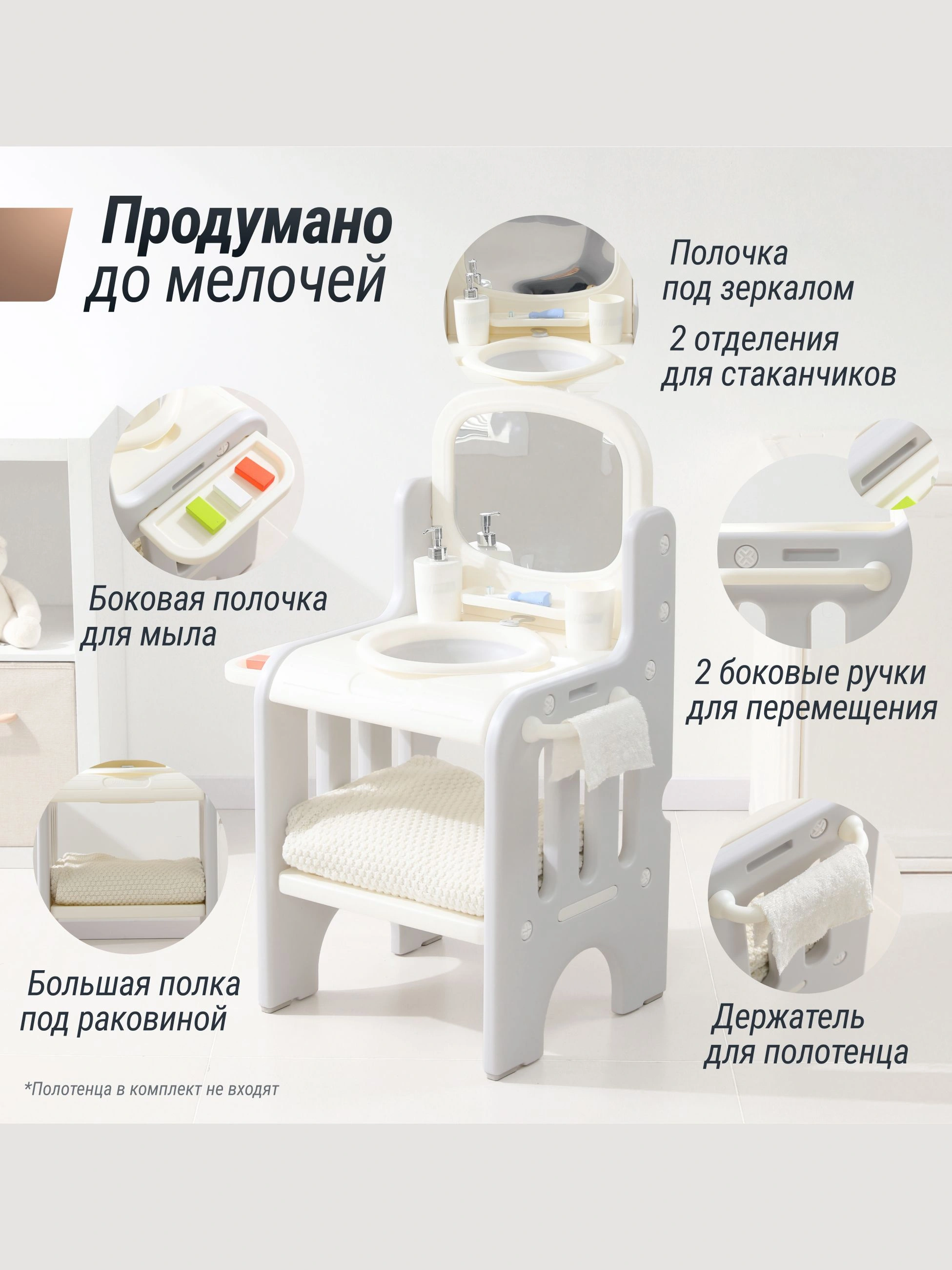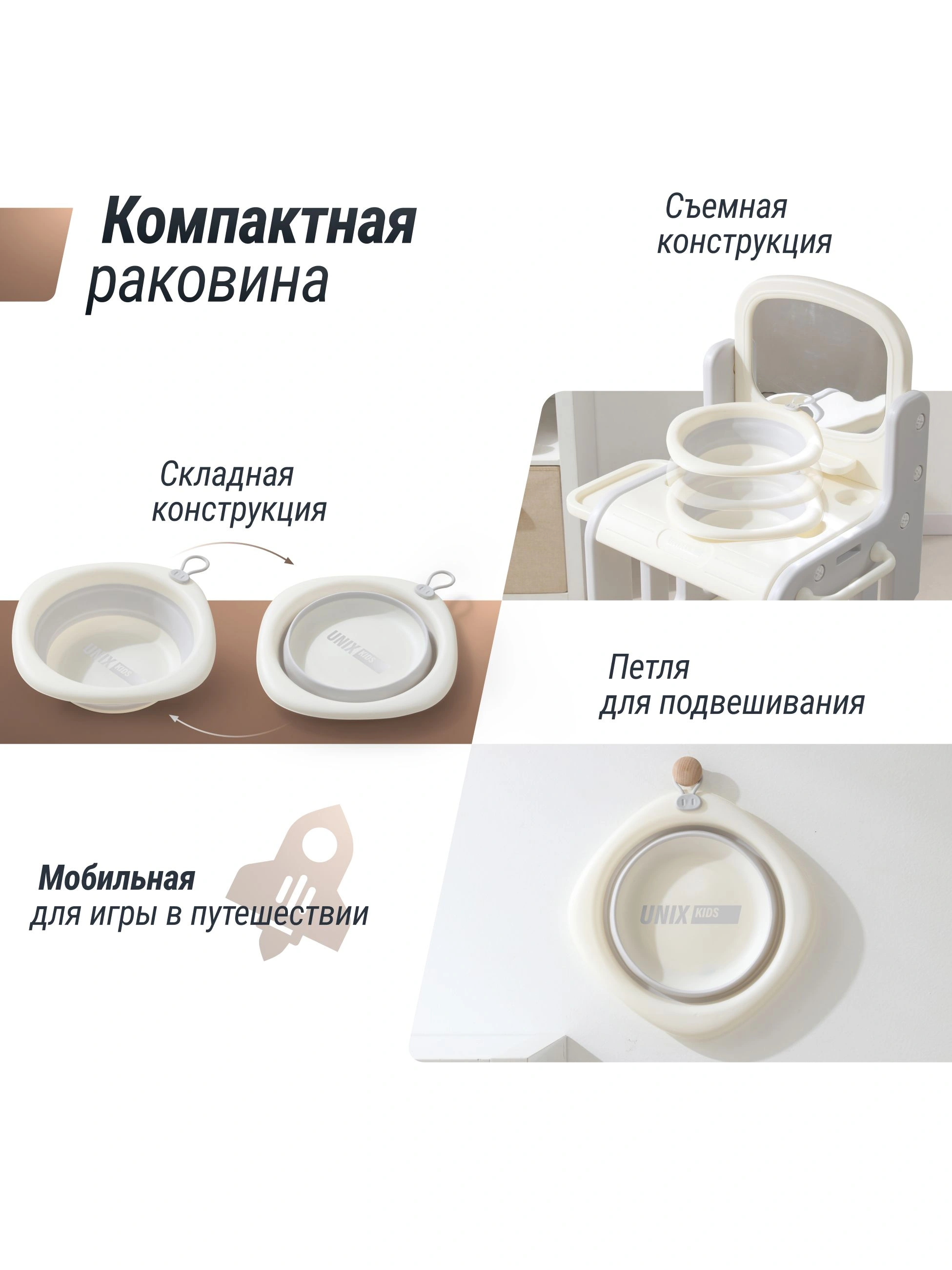 Детская развивающая игрушечная раковина UNIX Kids - прекрасный подарок для малышей. Умывальник детский разнообразит веселые игры и не оставит равнодушным ни одного юного пользователя! Маленькие исследователи известны любовью к играм с водой. Игровой умывальник можно использовать для мытья кукол или для купания игрушек. Малыш создаст свой собственный мир, ведь детская раковина может стать элементом настоящей игры в повара. Сюжетно - ролевые игры – парикмахерская для кукол или салон красоты развивают воображение, мелкую моторику и координацию, а также способствуют развитию речи, фантазии и навыков общения. Умывальник для малышей - настоящая развивающая игрушка. Игры с водой стимулируют воображение, помогая развить ребенку креативность. Рукомойник для детей Мойдодыр - прекрасный инструмент для обучения малышей, благодаря которому ребенок будет осваивать навыки личной гигиены. Пользуясь рукомойником, малыш сможет наблюдать за собой в безопасное зеркало. Аксессуары для личной гигиены – стаканчик для зубных щеток и мыла сделаны из качественных материалов. Продуман держатель для полотенец и открытая полочка под раковиной для игрушек, куда можно сложить детские вещи, игровые принадлежности и полотенца. Благодаря реалистичным аксессуарам, обучение ненавязчиво превратится в игру. Как и вся продукция UNIX Kids, раковина детская для игр с водой изготовлена из пищевого пластика и имеет сертификацию. Пищевой пластик гипоаллергенен, не имеет запаха и абсолютно безопасен для маленьких пользователей. Детский умывальник не подвержен UV-излучению, поэтому игрушка не выгорит на солнце и не потеряет свой цвет. Раковина с водой снимается со стойки и прекрасно моется, поэтому подходит для использования, как дома, так и на улице. Вы сможете брать ее с собой в дальние поездки, чтобы развлечь вашего непоседу. Сглаженные углы выполнены с большим вниманием к безопасности малыша. На ножках имеется специальное противоскользящее покрытие. Надежные шурупы помещены в углубления, не давая раскрутить их маленьким ручкам. Напольная детская раковина обладает небольшим весом и компактными размерами 46 х 43 х 92 см, благодаря чему ее легко перемещать. Развивающая игрушка UNIX Kids доставит вашему малышу бесконечное удовольствие в играх и обучении, подойдет для ванной и поможет в процессе обучения чистки зубов и умывания. Благодаря детскому умывальнику, ребенок почувствует себя, маленьким взрослым. Детский умывальник прекрасно впишется в обстановку детского сада, детской площадки, дачи, квартиры или дома. Это прекрасный подарок на день рождение, Новый год девочке и мальчику, внуку или внучке. С таким подарком, любой праздник станет незабываемым событием и сделаете малыша еще более счастливым!