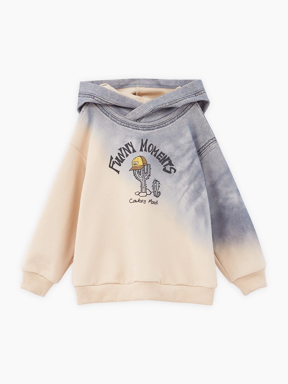 Комфортное худи базового светло-бежевого оттенка для мальчика. Прямая объёмная модель. Глубокий капюшон. Спущенная линия плеча. Эластичные манжеты и низ изделия из рибаны. Худи из тактильно приятного материала. Авторские принты.