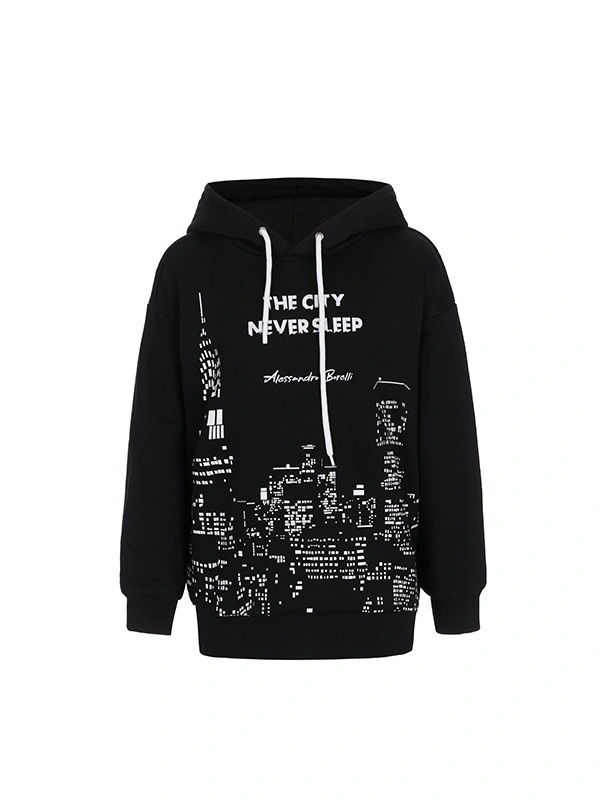 Худи ALESSANDRO BORELLI для девочек выполнено в стиле коллекции Orchid. Модель в чёрном цвете отличается элегантным и стильным дизайном. На передней части худи изображен ночной город с элементами архитектуры и надписью "THE CITY NEVER SLEEP". Свободная модель имеет глубокий капюшон с контрастными белыми завязками, манжеты на рукавах и планку по низу изделия. Толстовка будет удобна для прогулок или занятий спортом. Худи выполнено из приятного к телу материала с большим добавлением хлопка. Не боится частых стирок: ткань не выцветает и не заламывается. Хорошо подойдет для активного отдыха.