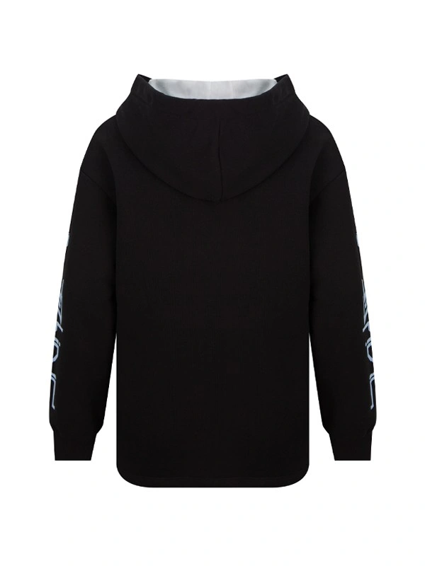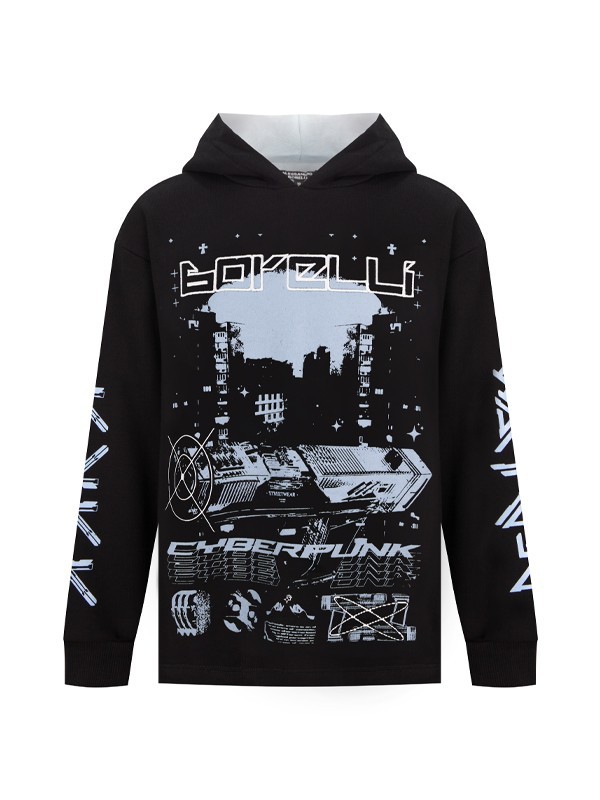 Худи ALESSANDRO BORELLI для мальчика выполнено в черном цвете. Модель обладает длинными рукавами, глубоким капюшоном, а также манжетами на рукавах. На передней части изображён крупный графический принт в стиле киберпанк с элементами технологии и футуристической архитектуры в голубых и белых тонах. На рукавах также размещены надписи и графические элементы, дополняющие общий дизайн. Толстовка будет удобна для прогулок или занятий спортом. Худи выполнено из приятного к телу материала с большим добавлением хлопка. Модель для мальчика не боится частых стирок: ткань не выцветает и не заламывается. Хорошо подойдет для активного отдыха.