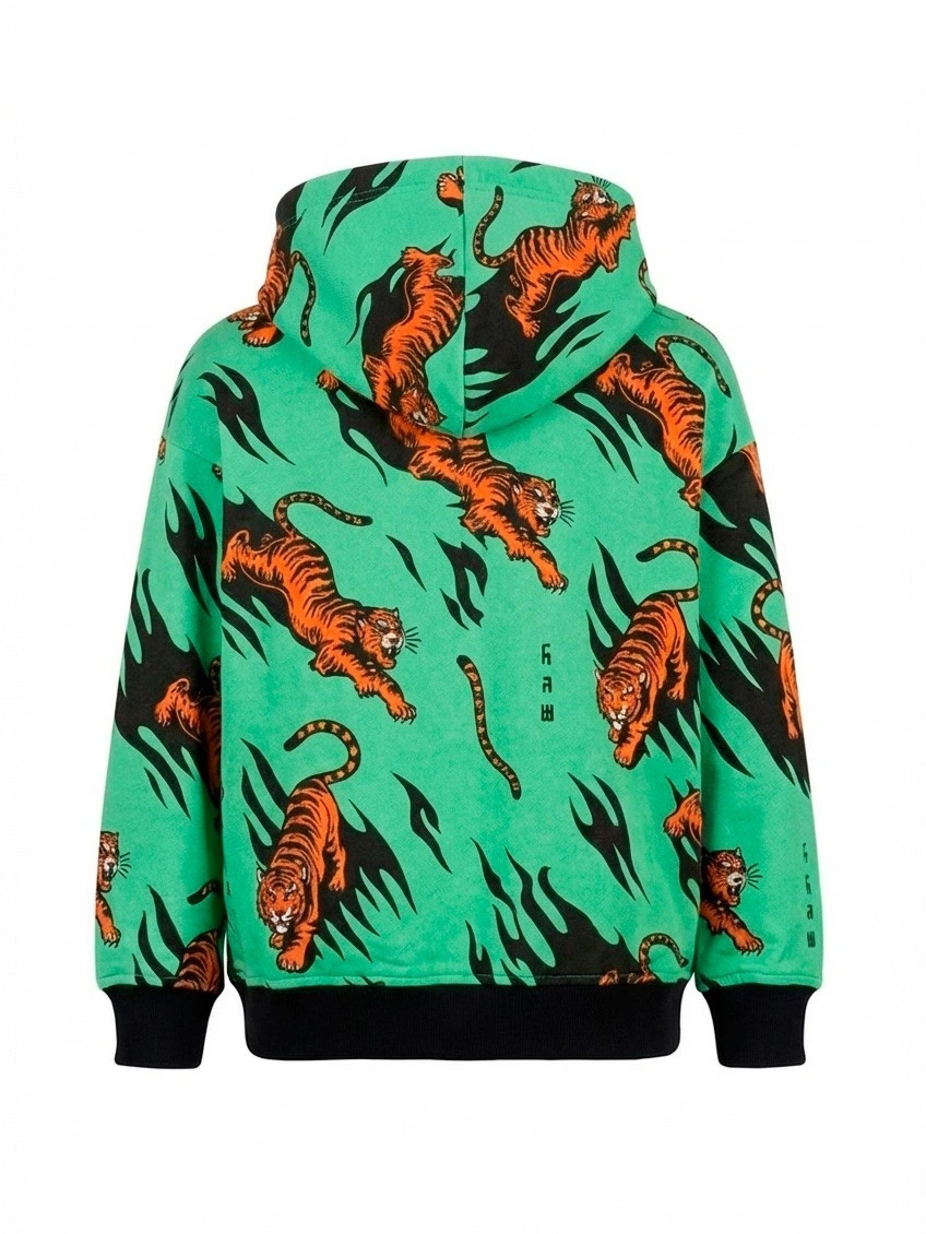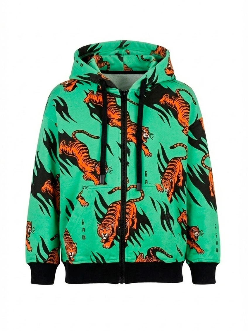Зеленая толстовка для мальчика с тиграми. Яркая толстовка на молнии с капюшоном для мальчика украшена стильным принтом с тиграми по всему полотну. Карманы спереди, чёрные трикотажные манжеты и резинка по низу обеспечивают тепло и комфорт. Идеально для прогулок и повседневного образа. Купить детскую толстовку с принтом тигр — выбор для активных детей.