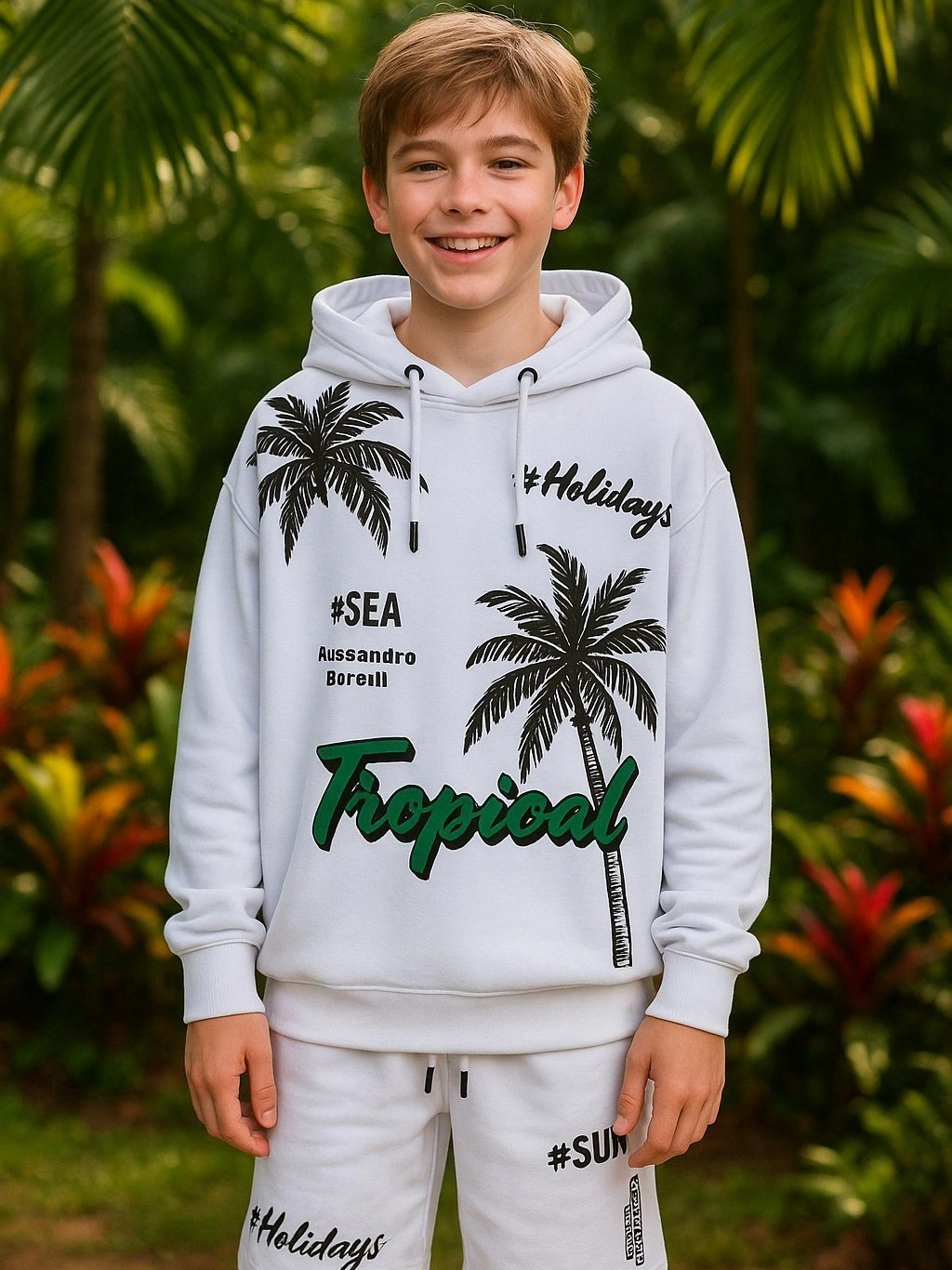Худи ALESSANDRO BORELLI для мальчика идеально сочетаются как с другими позициями из коллекции Tropical, так и с любыми брюками или шортами. Модель обладает длинными рукавами, глубоким капюшоном, а также манжетами на рукавах и планкой по низу изделия. Основной цвет — белый, украшен графическими принтами с изображением пальм, надписями «#Holiday», «#SEA», «Tropical» и «Alessandro Borelli». Принты выполнены в чёрном и зелёном цветах, создавая контраст и задавая яркое настроение отпуска и моря. Толстовка будет удобна для прогулок или занятий спортом. Худи выполнено из приятного к телу материала с большим добавлением хлопка. Модель для мальчика не боится частых стирок: ткань не выцветает и не заламывается. Хорошо подойдет для активного отдыха.