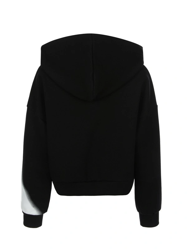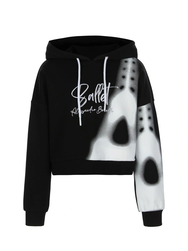 Худи ALESSANDRO BORELLI для девочек выполнено в стиле коллекции Ballet. Укороченная модель в черном цвете украшена контрастным белым принтом, который напоминает силуэт Эйфелевой башни, с добавлением художественного эффекта размытости. На груди надписи "Ballet" и "Alessandro Borelli". Свободное худи с длинными рукавами имеет глубокий капюшон с белыми завязками, манжеты на рукавах и планку по низу изделия. Толстовка будет удобна для прогулок или занятий спортом. Худи выполнено из приятного к телу материала с большим добавлением хлопка. Не боится частых стирок: ткань не выцветает и не заламывается. Хорошо подойдет для активного отдыха.