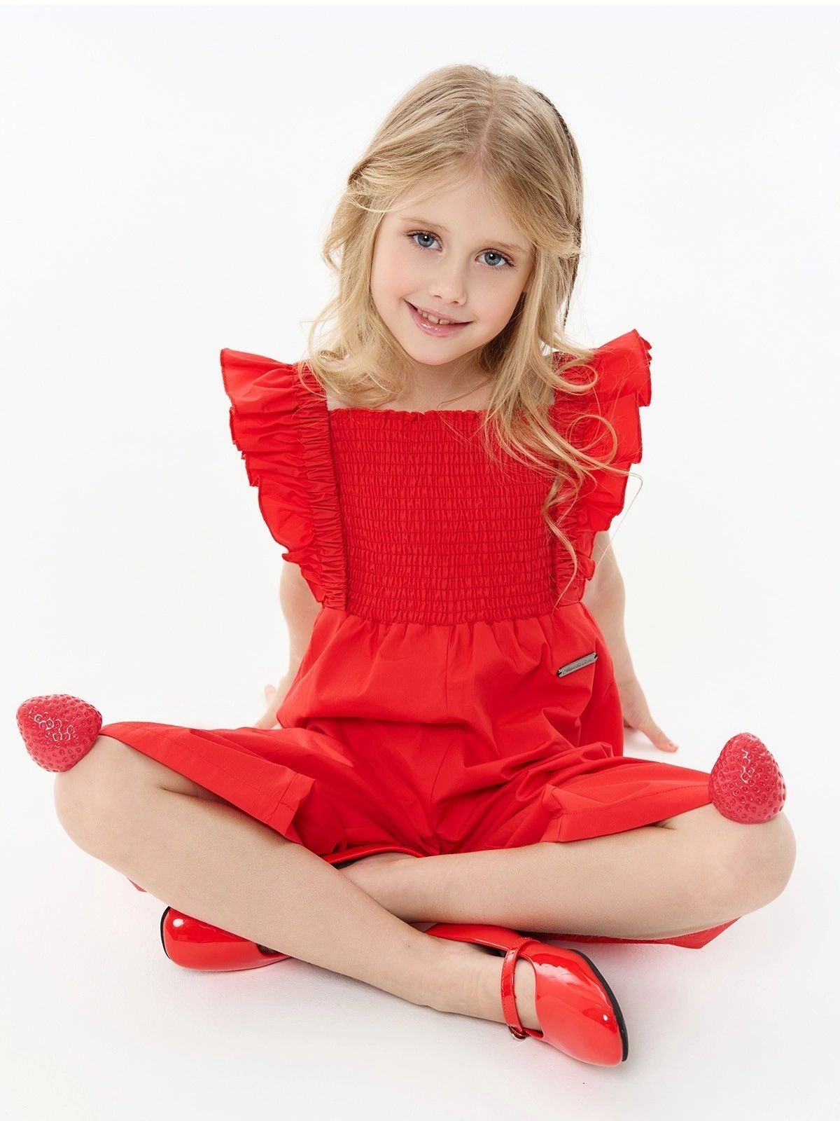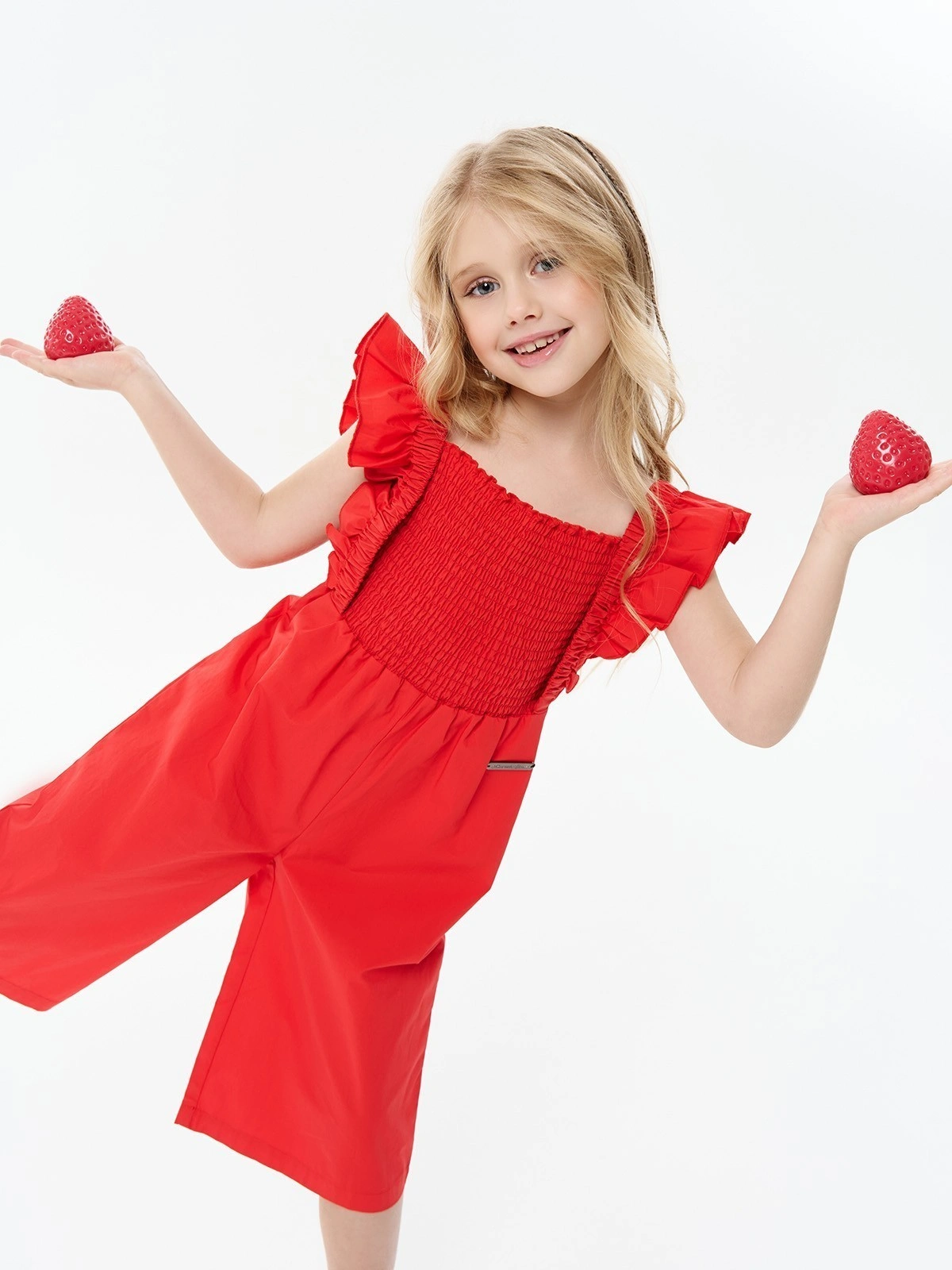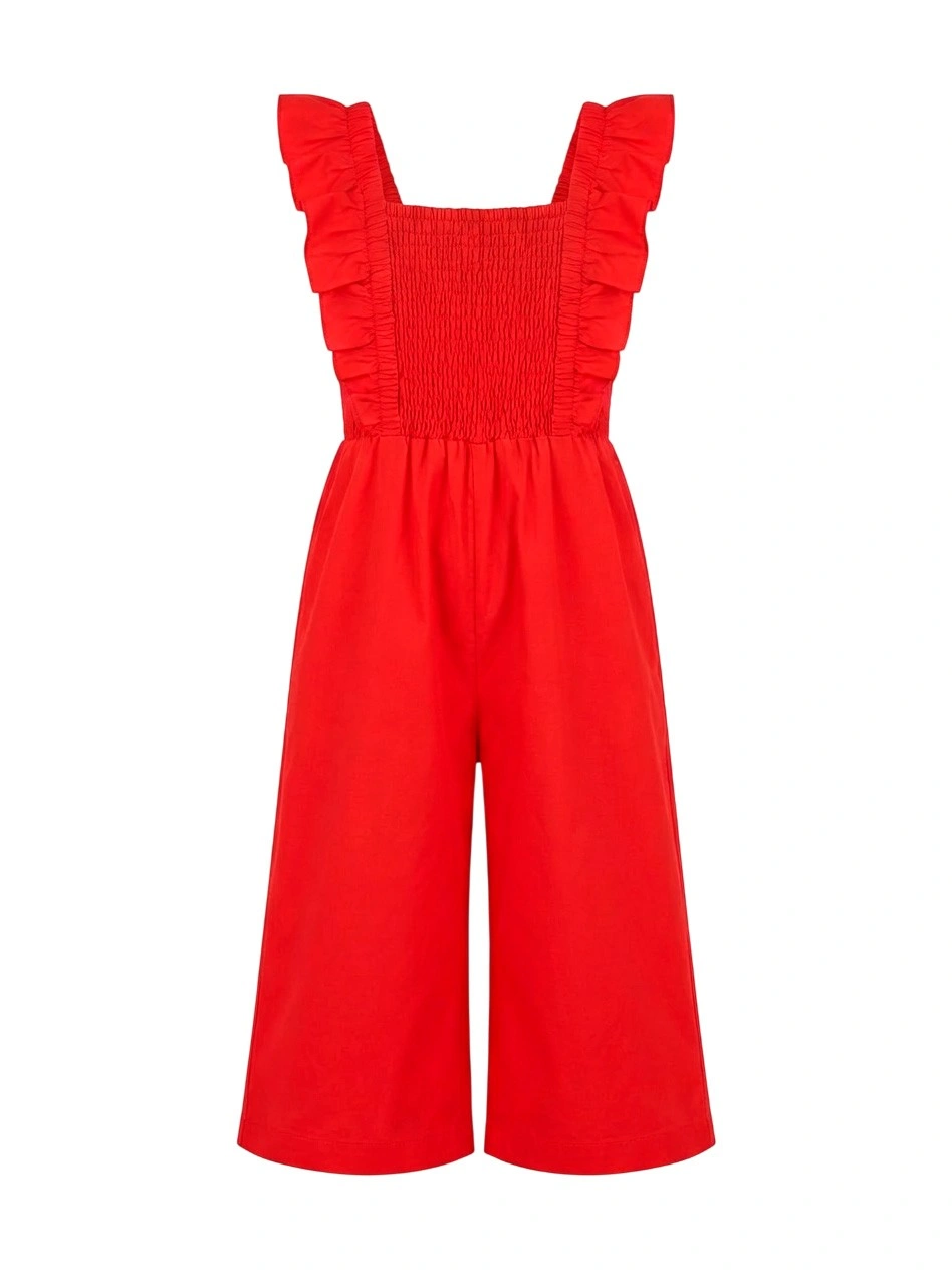 Красный летний комбинезон с рюшами для девочек. Яркий комбинезон насыщенного красного цвета выполнен из легкой ткани с квадратным вырезом и воздушными рюшами на бретелях. Эластичная присборенная резинка на лифе обеспечивает комфортную посадку и регулируемую ширину. Свободные укороченные брюки создают расслабленный летний силуэт. Эластичная резинка на талии для удобства. Стильная модель идеально подходит для жаркой погоды. Отлично сочетается с сандалиями и босоножками. Легкая ткань обеспечивает воздухопроницаемость.