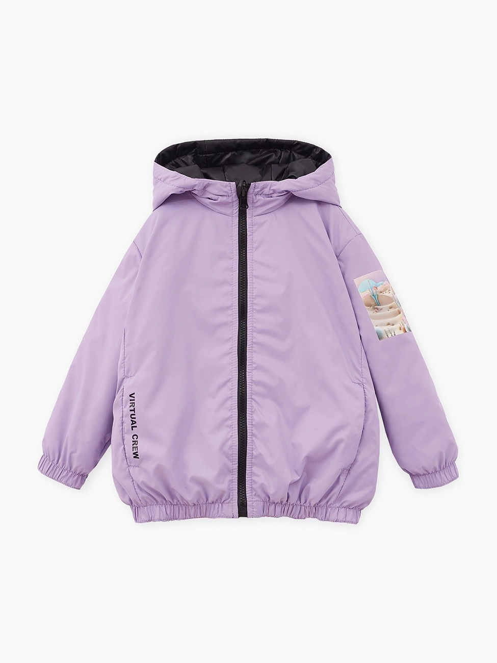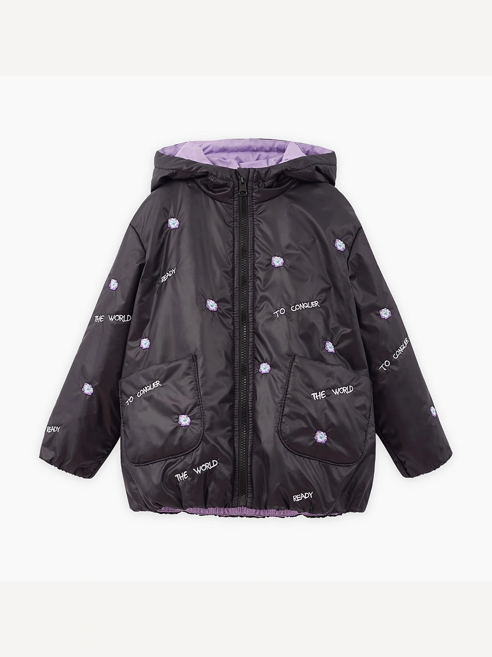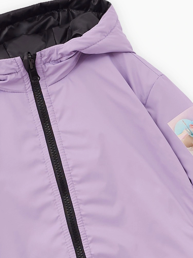 Объёмная модель. Спущенная линия плеча. Манжеты и низ изделия на мягкой резинке. Лиловая сторона декорирована авторскими принтами, чёрная – дизайнерской вышивкой. Рекомендуемая температура: +5…+15, в зависимости от второго слоя и особенностей ребёнка.