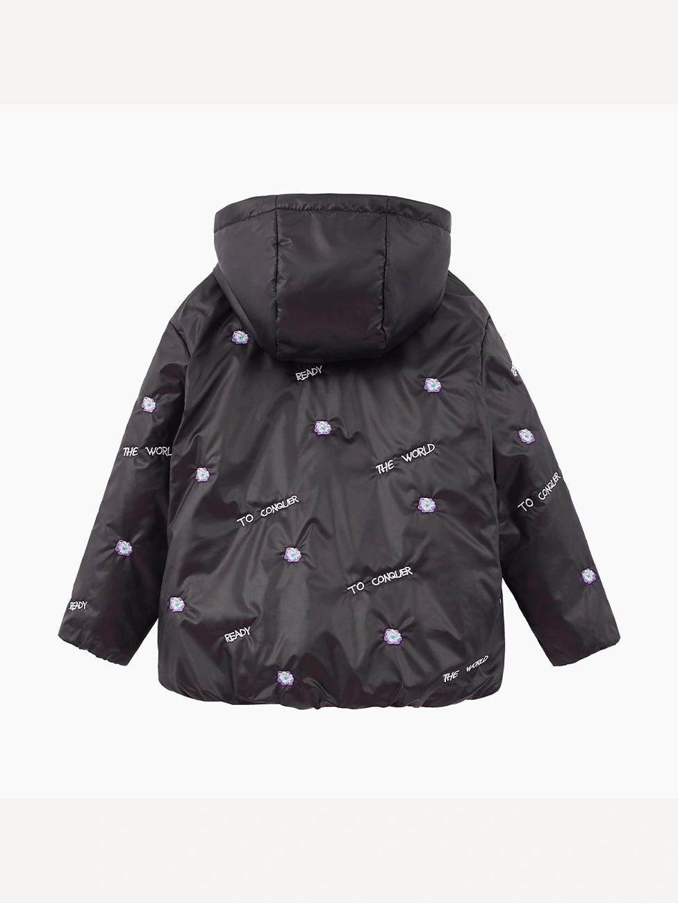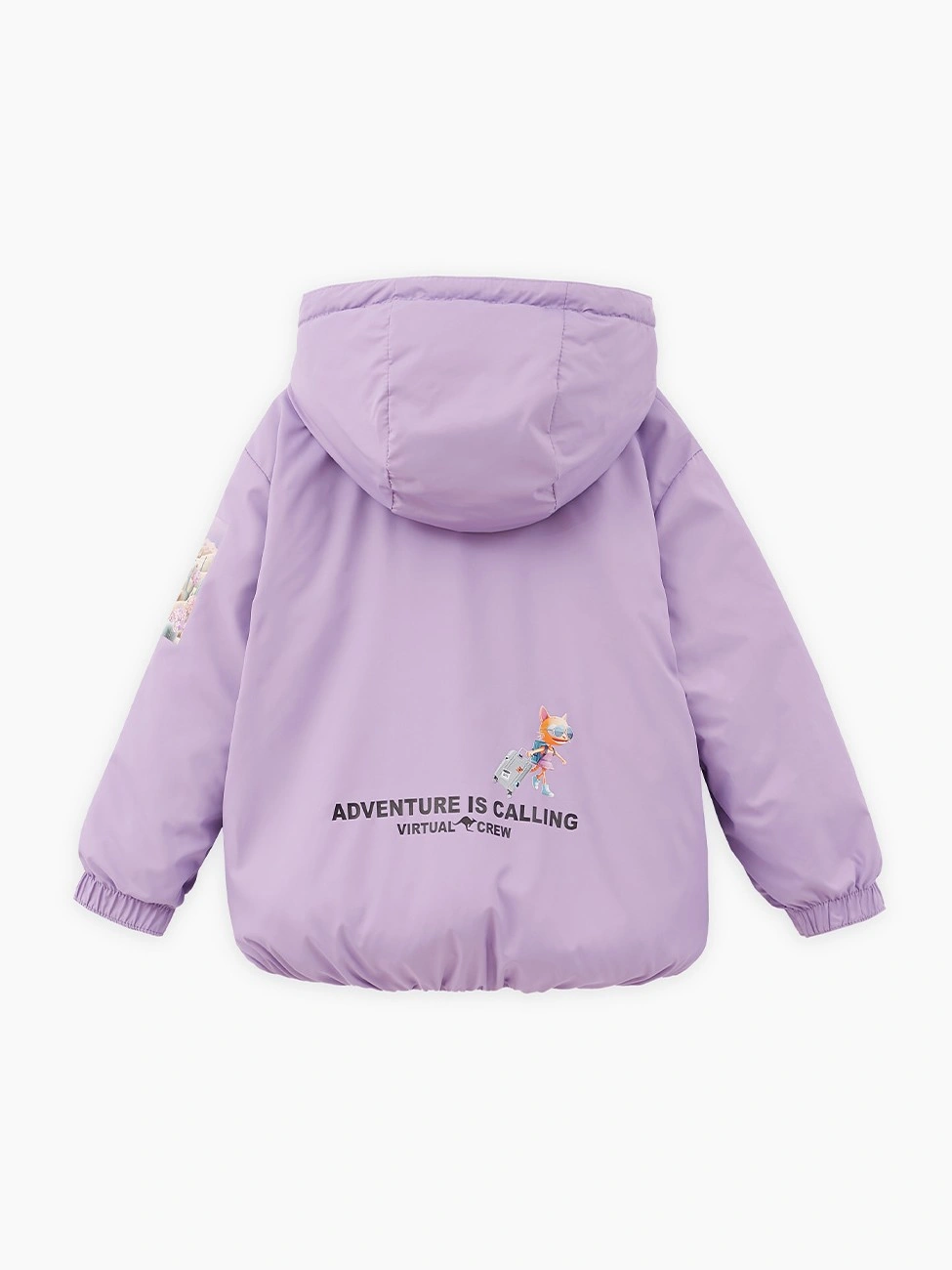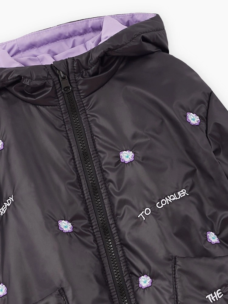 Объёмная модель. Спущенная линия плеча. Манжеты и низ изделия на мягкой резинке. Лиловая сторона декорирована авторскими принтами, чёрная – дизайнерской вышивкой. Рекомендуемая температура: +5…+15, в зависимости от второго слоя и особенностей ребёнка.