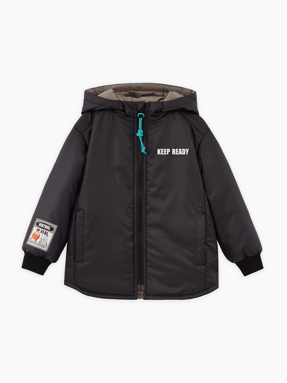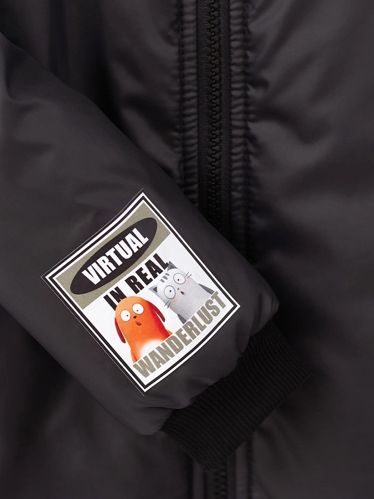 Прямая модель. Приспущенная линия плеча. Эластичные манжеты. Куртка декорирована авторскими принтами. Декоративная подвеска на молнии. Рекомендуемая температура: +5…+15, в зависимости от второго слоя и особенностей ребёнка.