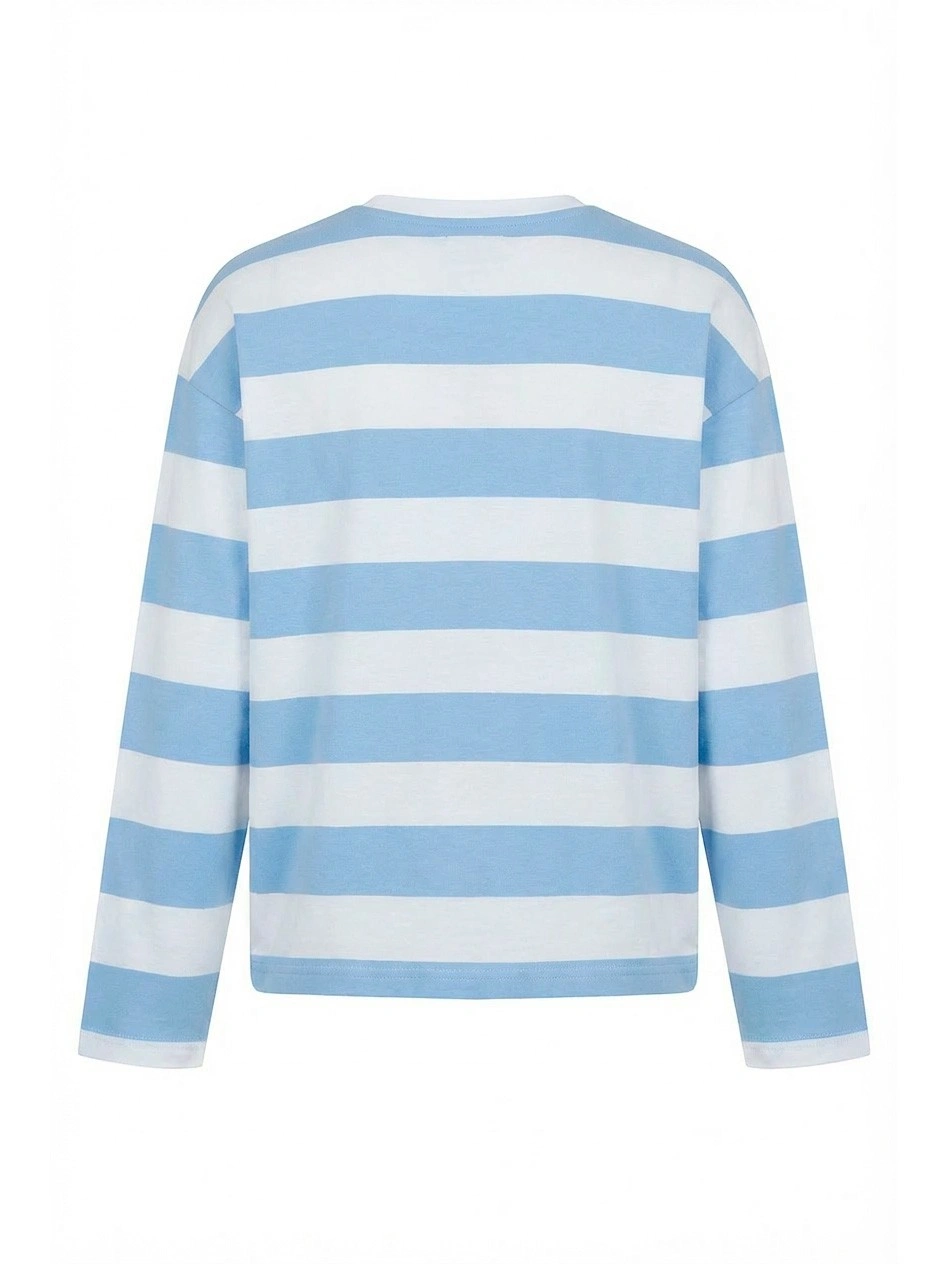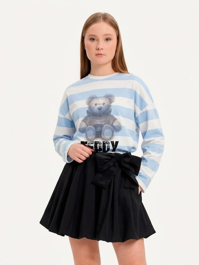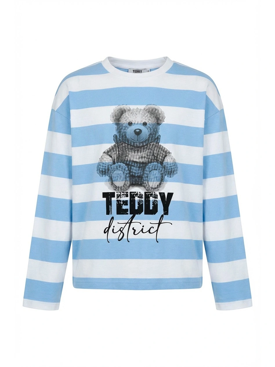 Лонгслив в полоску с мишкой для девочек. Стильный лонгслив в широкую голубо-белую полоску свободного кроя выполнен из мягкого хлопкового трикотажа с классическим круглым вырезом и длинными рукавами. Яркий принт с изображением плюшевого мишки в клетчатом свитере, выполненный в сине-серых тонах с эффектом растра. Под мишкой — надписи "TEDDY" черными буквами с текстурой и "district" элегантным курсивом. Универсальная модель для повседневной носки. Отлично сочетается с джинсами, юбками и леггинсами. Качественный материал обеспечивает комфорт и тепло.