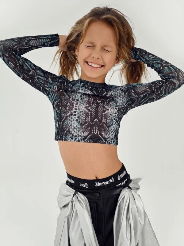 Лонгслив ALESSANDRO BORELLI для девочки идеально сочетается как с другими моделями из коллекции Snakes, так и с базовыми джинсами или шортами. Укороченная модель украшена эффектным змеиным принтом в бирюзовом цвете, что придаёт изделию изысканный вид. Лонгслив имеет круглую горловину и длинные рукава. Строго ухода модель не требует: после стирки рисунок останется таким же ярким. Подходит для повседневных образов или особых случаев, добавляя яркость в гардероб.